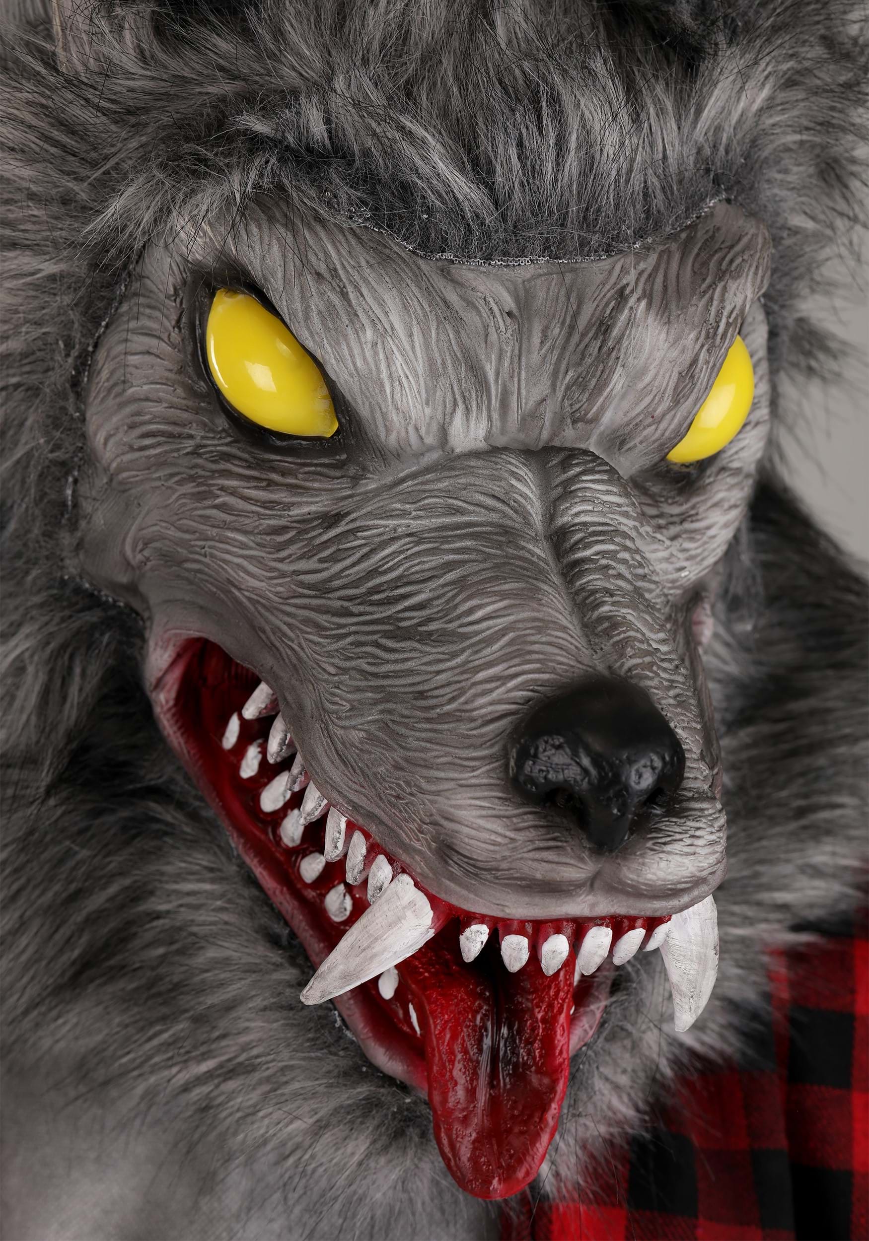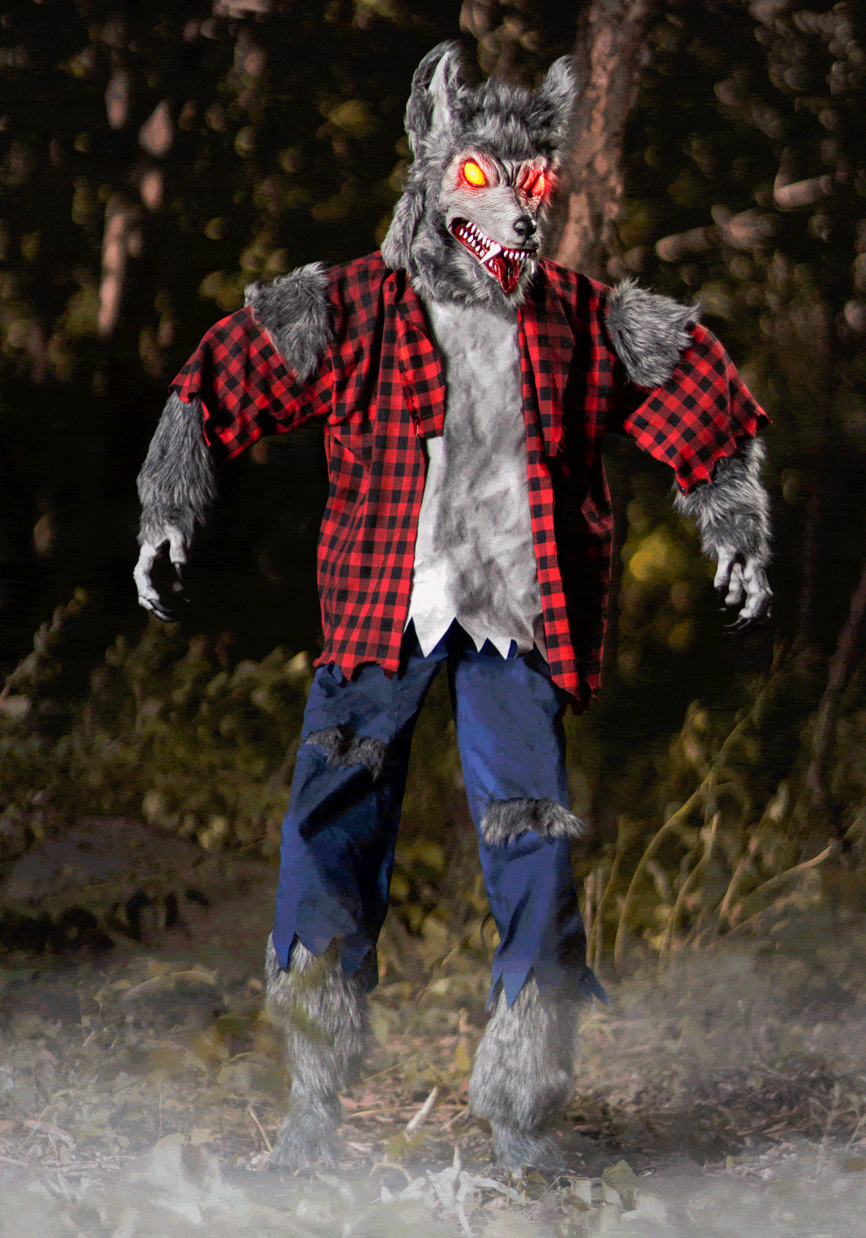 Thrills and chills abound when you set up this exclusive Classic Animated Werewolf Halloween Decoration in your home, yard, or haunted attraction! The life-sized figure is covered with gray faux fur and wears a slashed plaid shirt over a distressed white undershirt and ripped blue pants. When activated, its eyes glow in its snarling face, its head moves back and forth to track its victims, and it plays fearsome pre-recorded sound effects!