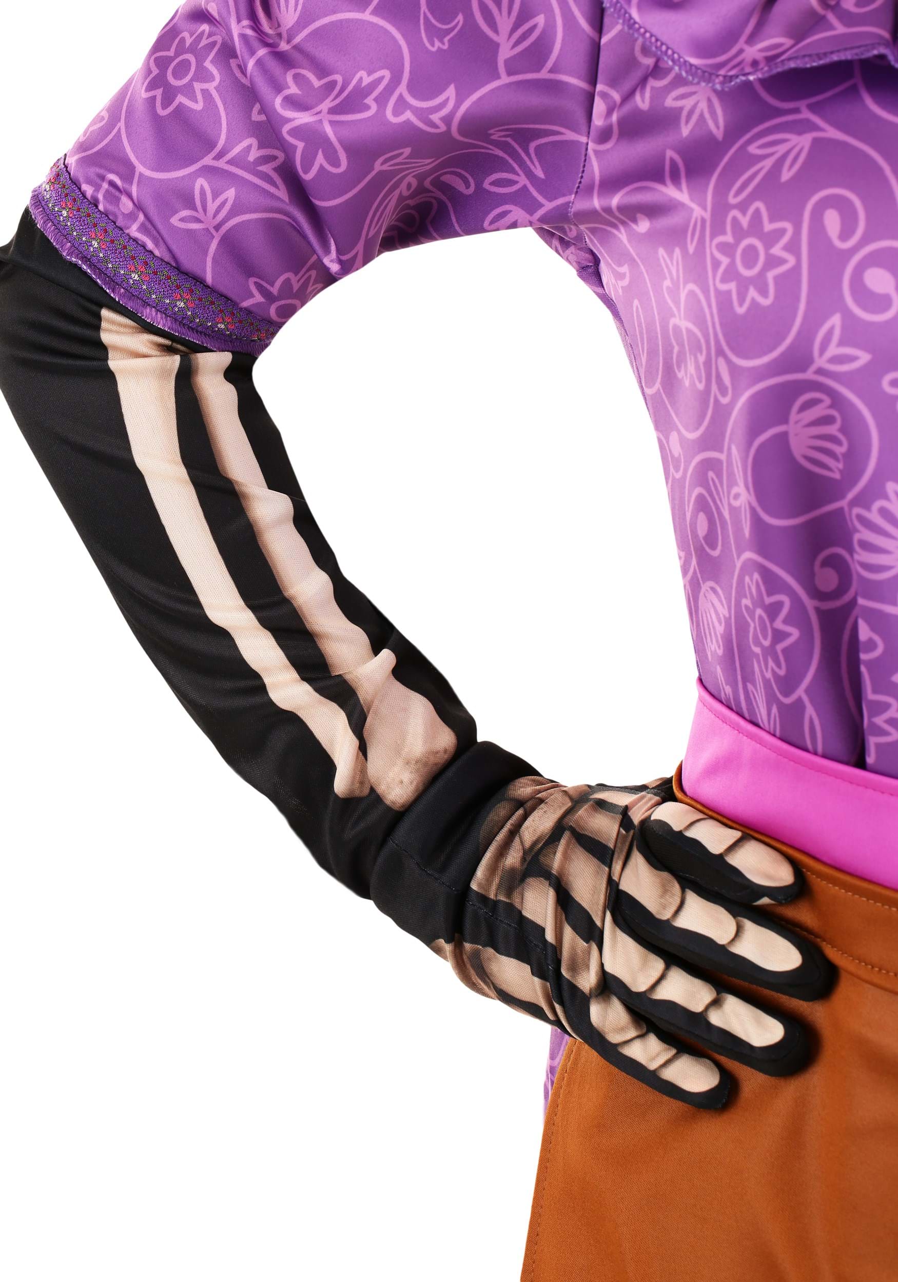 Dance your way into the season with this exclusive and officially licensed Mama Imelda costume from Coco. Your ensemble begins with a detailed purple paisley dress that features ruffled shoulders and skeletal details on the arms and neckline. A faux leather apron keeps you in matriarch style as well. The wig gives you dark black hair with just the right amount of white strands to show how hard you work to keep your family together! Add some face paint to finish your look and you're ready to bring Coco to life.
