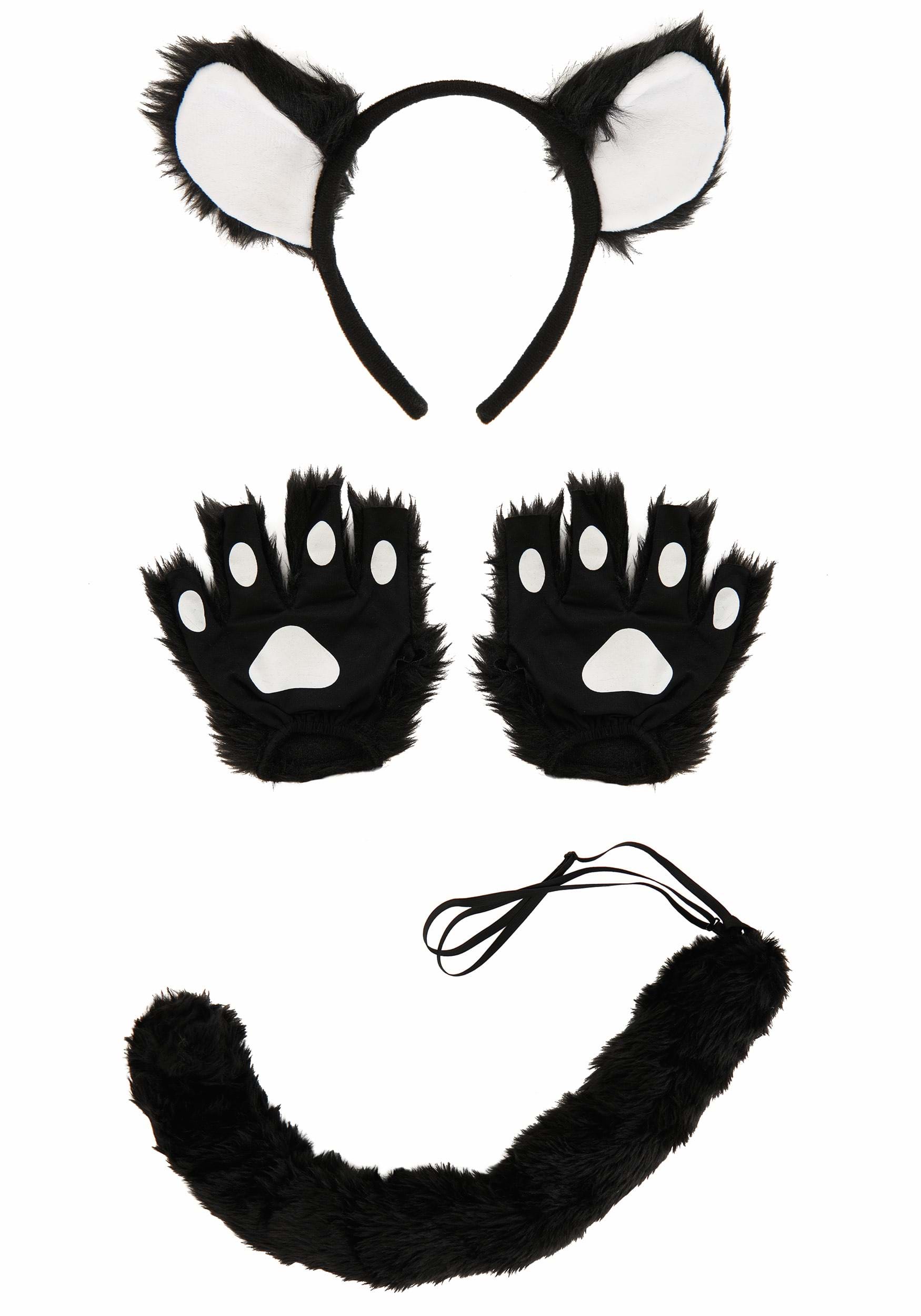 This furry kit is comprised of a headband, fingerless gloves and a tail. Luxurious long pile black fur will transform you into a serious kitty that has some serious style. Tall cat ears are attached to a plastic headband, and fingerless gloves have white paw pads. Just grab a safety pin to attach the tail and you'll be a frisky feline for sure!