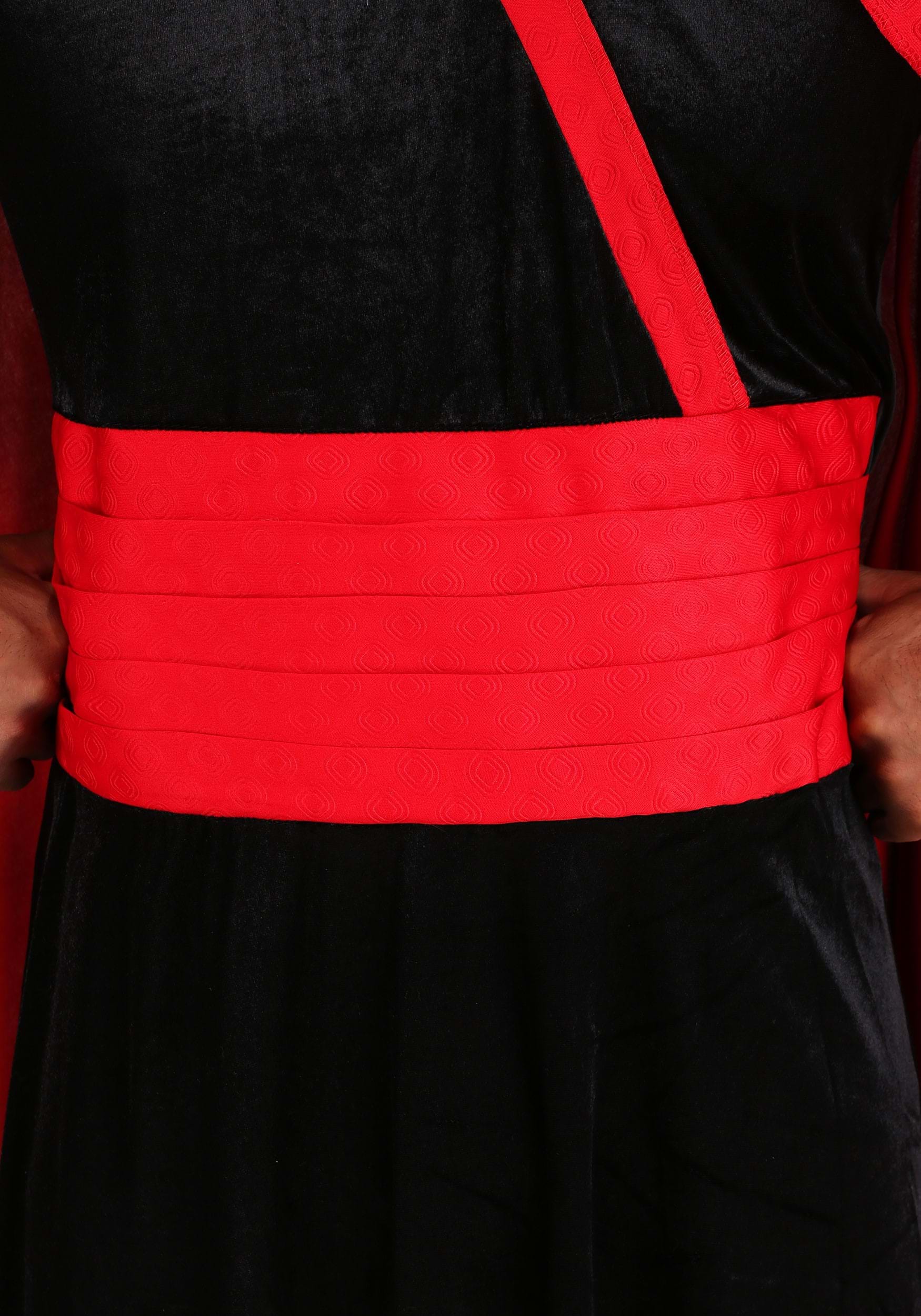 This Jafar ensemble is lush with full, billowing themes and a cape that will make your evil entrance a real show stopper! The body of the look has a velvety texture with a wrap look at the top. The waist is wrapped with the same textured red fabric of the sleeves. The pointed shoulders would make any villain proud. And the whole look is topped with a velvet hat with a satin accent and a large jewel at the hem and is finished off with a dramatic red veil.