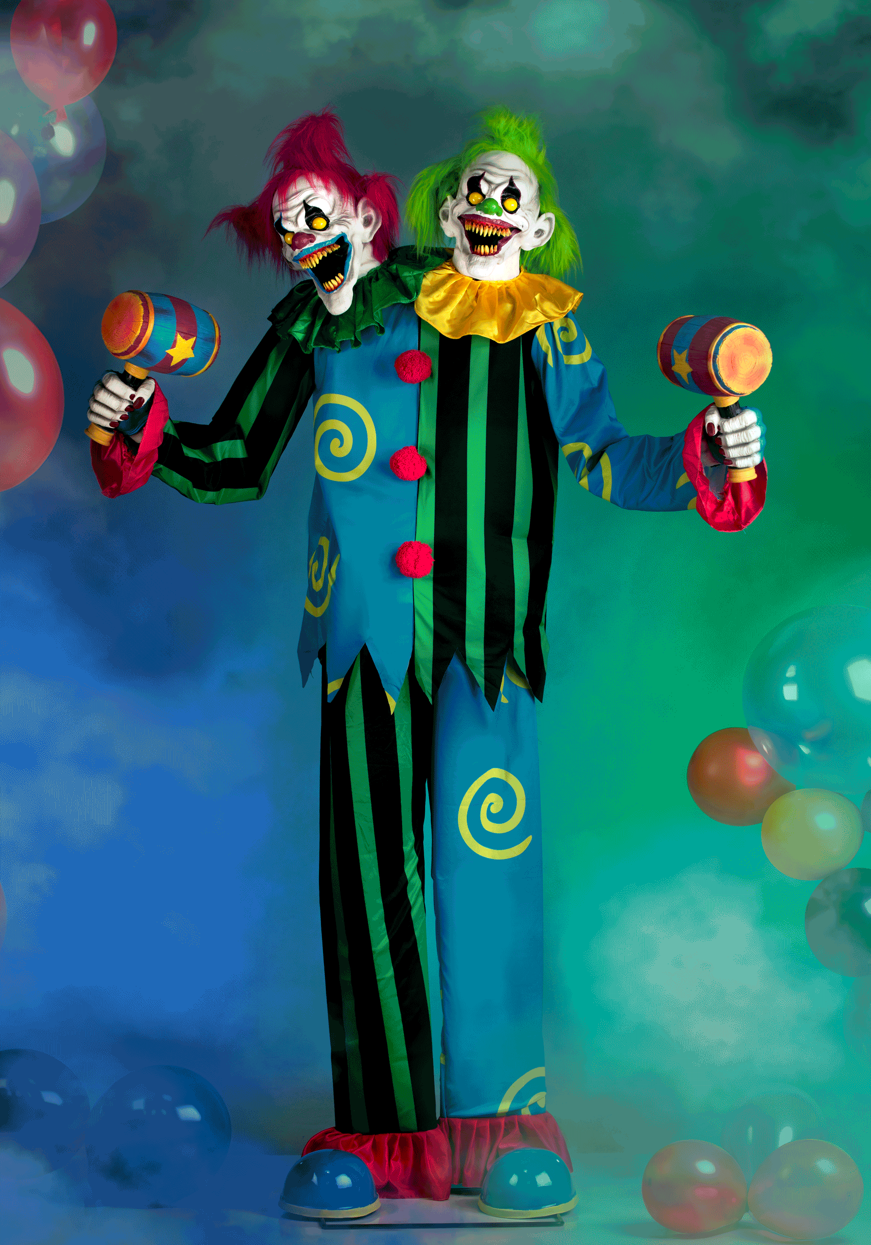 This absolutely terrifying animatronic is shaped into the form of a 2-headed clown. One clown has bright red hair, and the other has bright green hair. Each head has frightening features, like a wide smiling face with menacing teeth, glaring yellow eyes, and classic clown makeup. The figure is wearing clown attire, including an asymmetrical clown outfit, complete with stripes and swirls. Each hand is holding a mallet with fake book splattering on them.