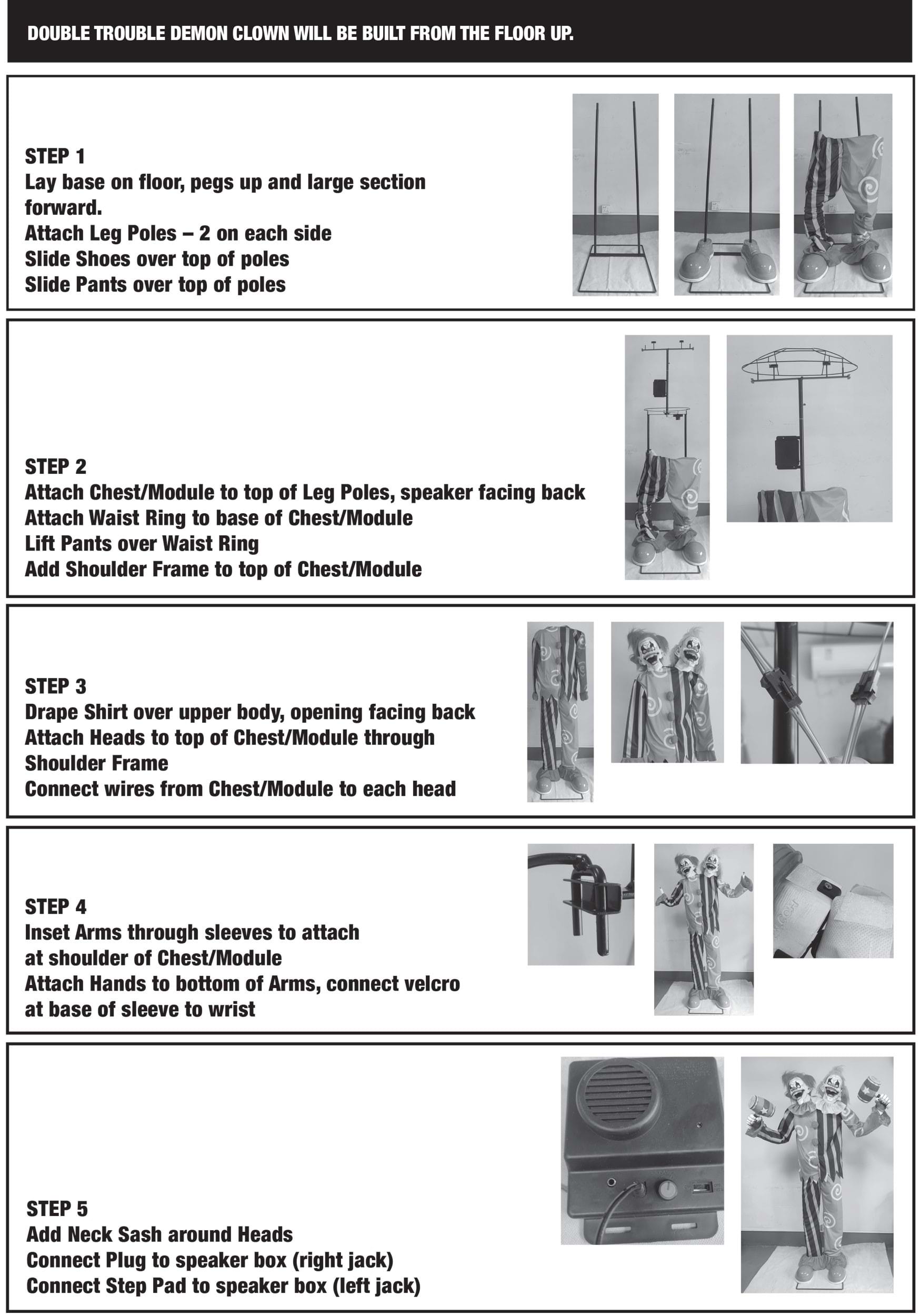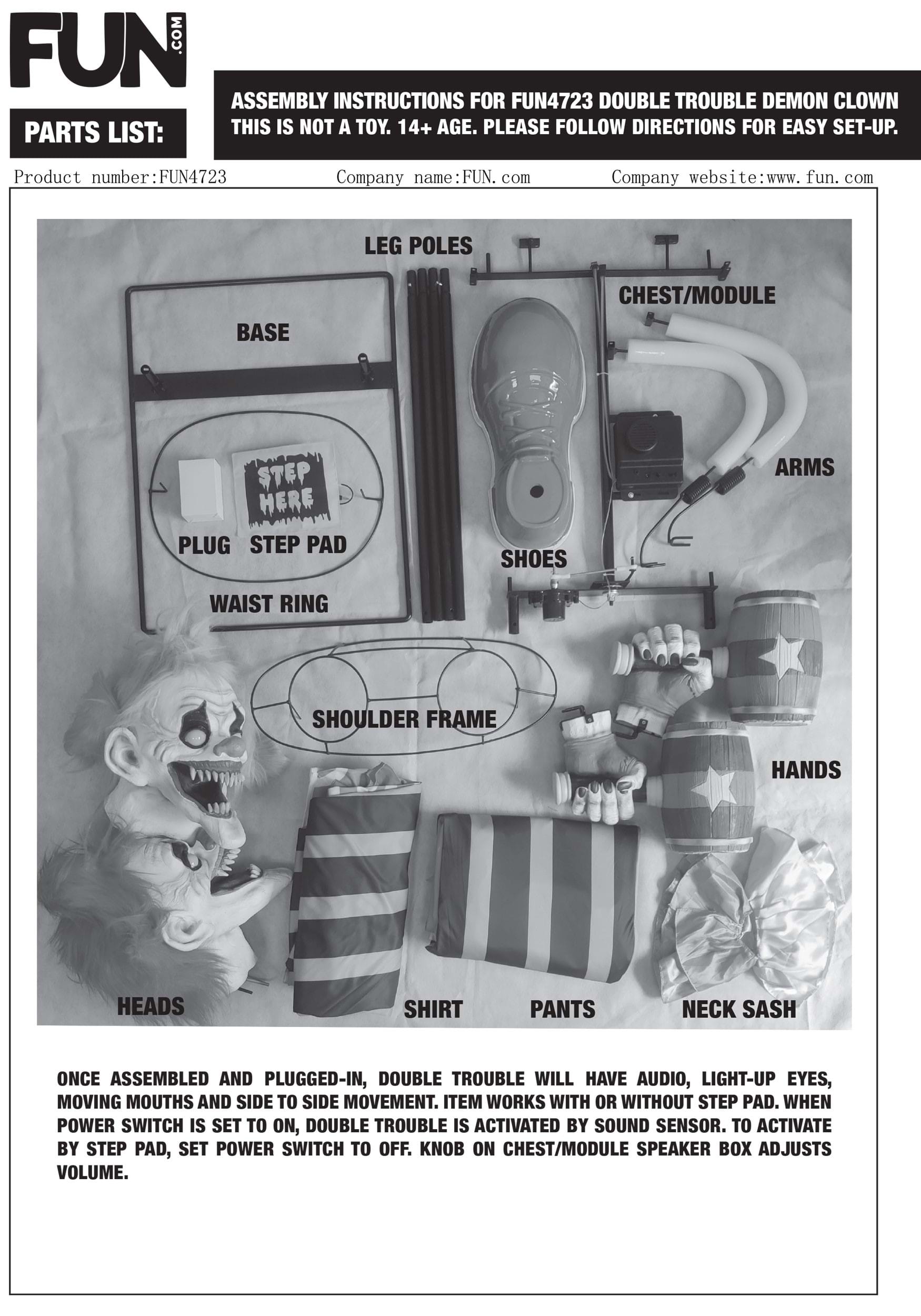 • Clown laughs, eerie music plays, eyes light up, mouths move and speak 5 phrases to each other