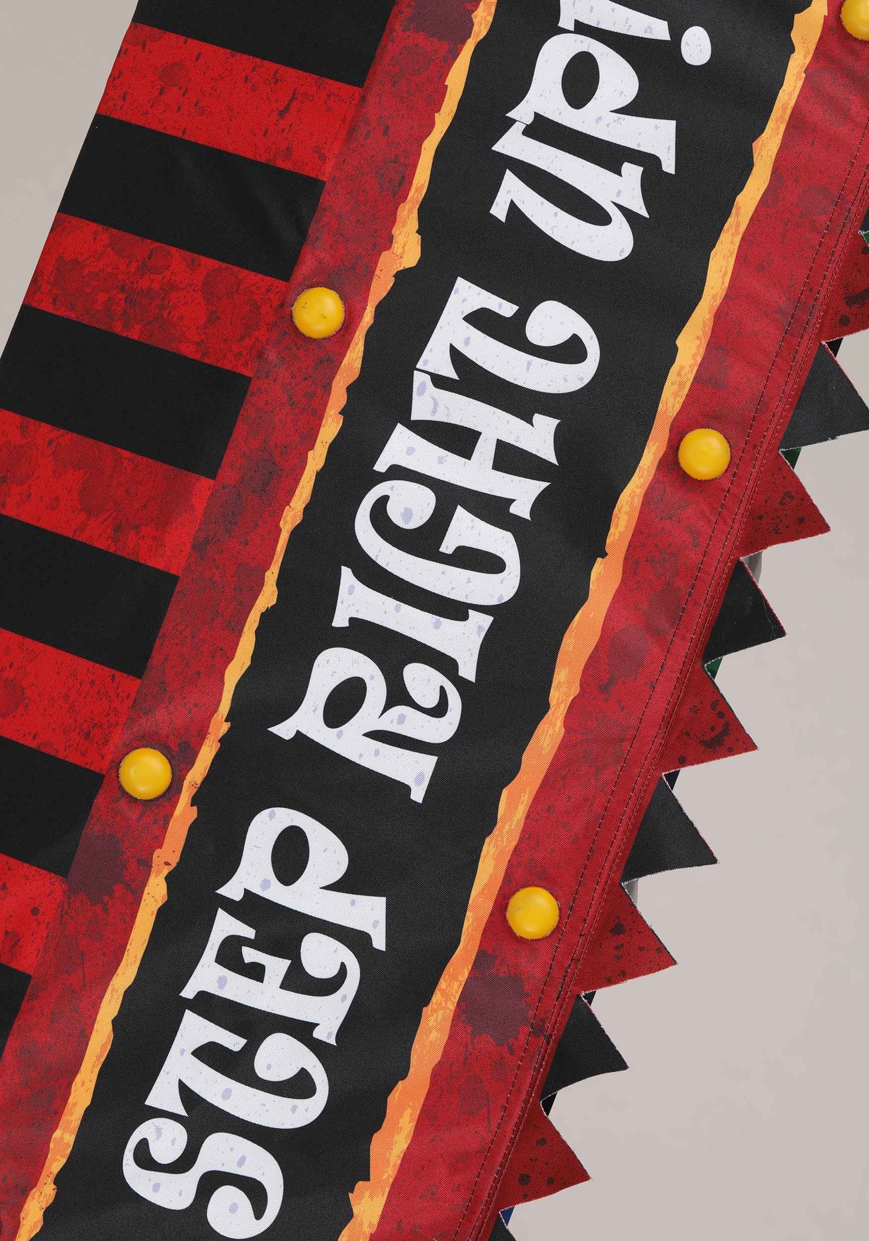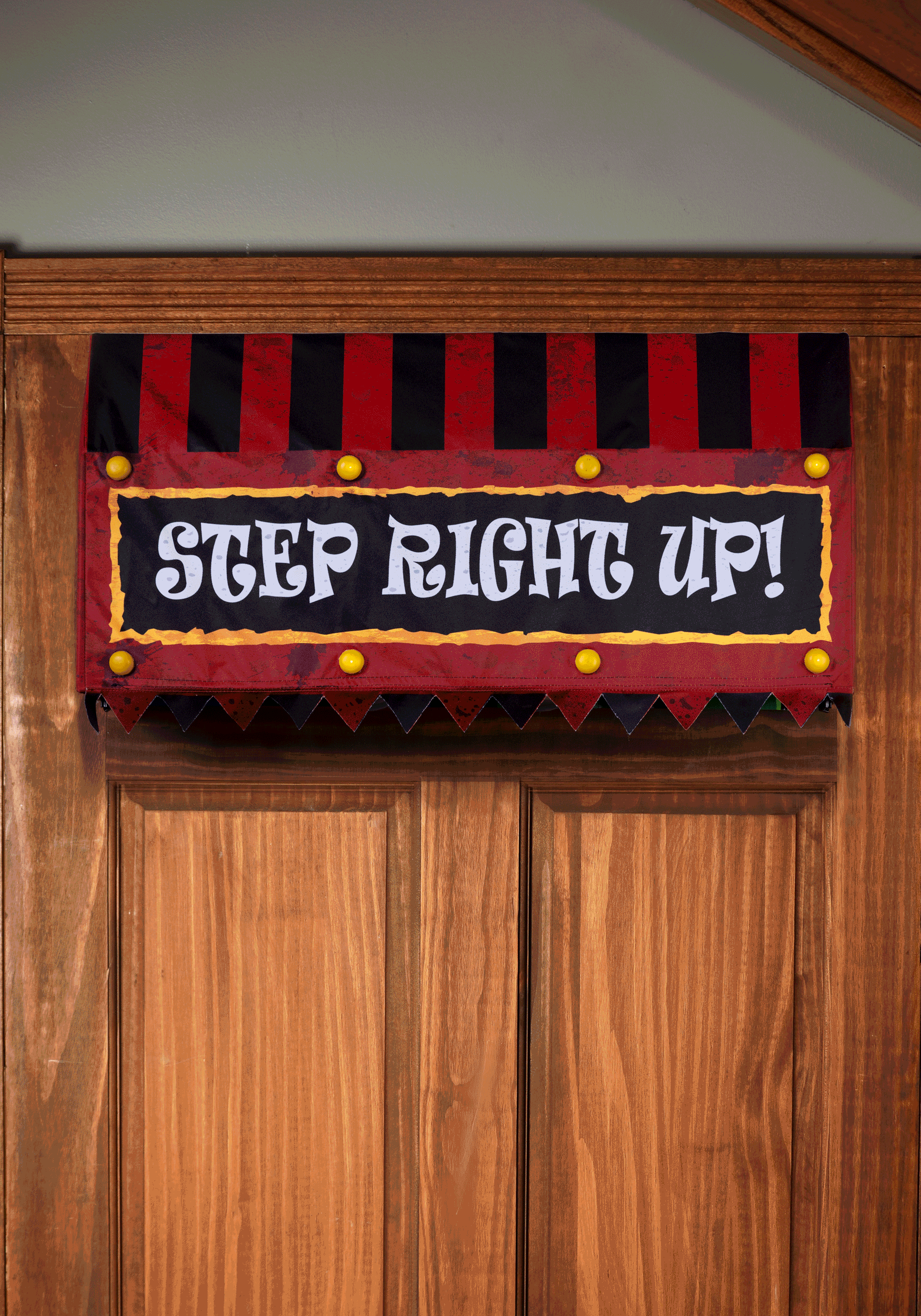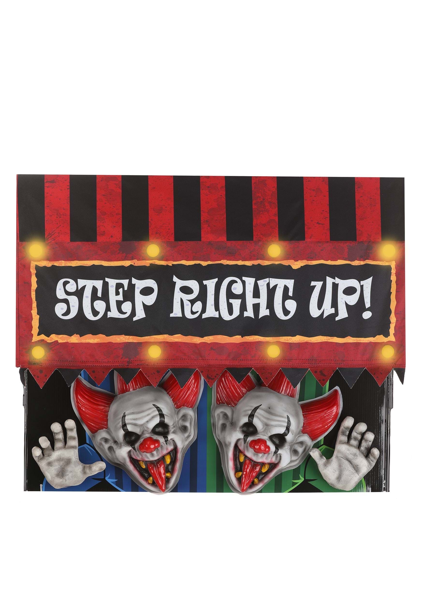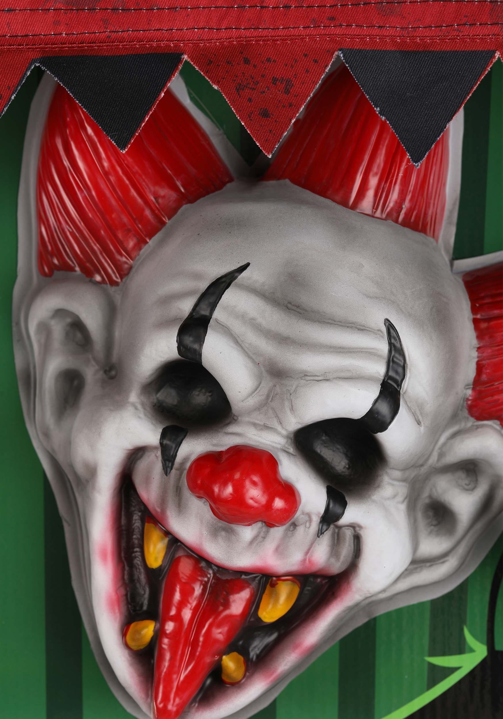 The hanging decoration starts as an inconspicuous fabric awning that is great for greeting guests at the entrance to your very own haunted circus. When powered on, its vintage style and not-so-subtle distressing plays backup to a pair of creepy clowns dropping in to cause a scream! The clowns are sculpted and painted with exaggerated grins and reaching hands. Set against a black panel, their reach seems further and sure to surprise every Halloween visitor!