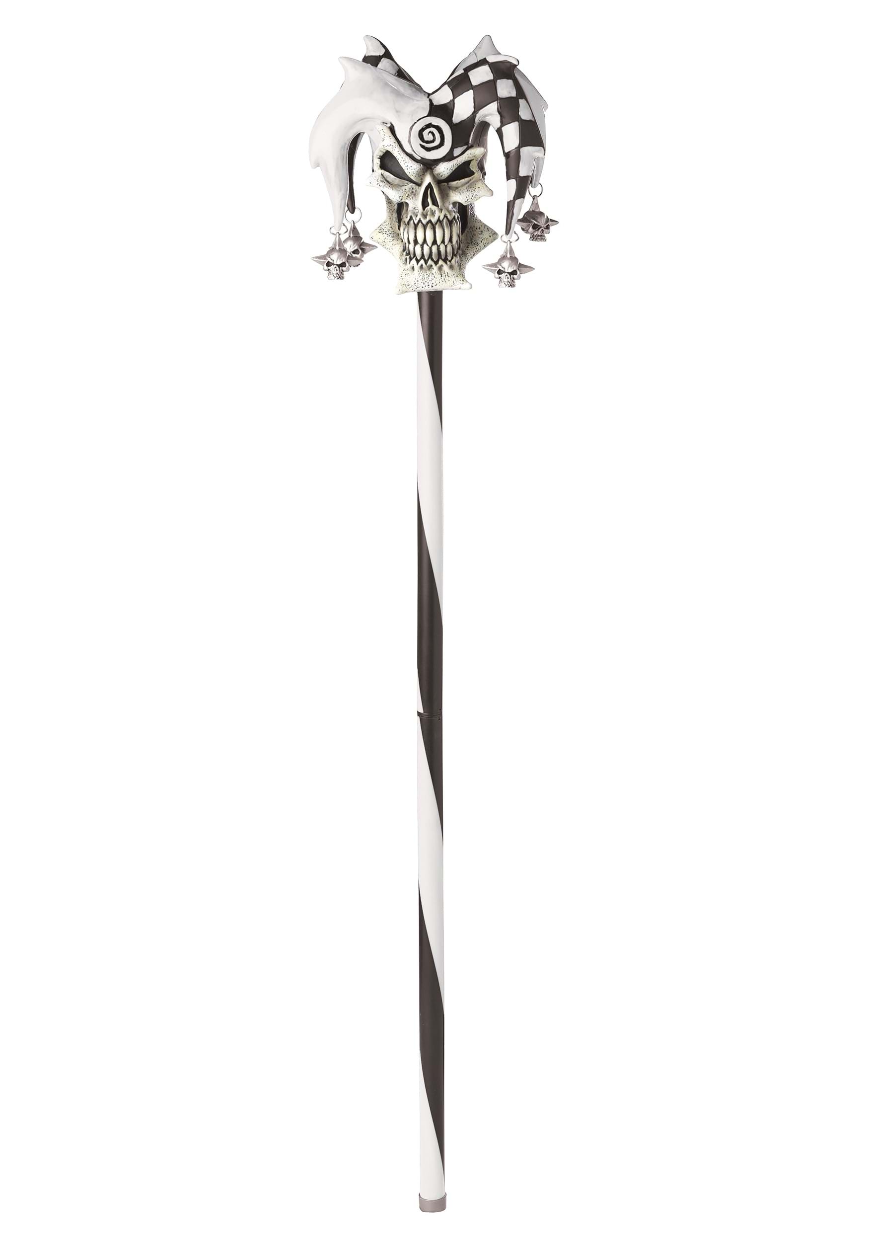 Add some fright to your act when you use this Psycho Jester Black and White Costume Cane! A plastic cane is striped with stark black and white. On top of it sits a terrifying plastic skull that bares its teeth in a fanged grin. It wears a multi-patterned black and white jester hat with four tips. A mini skull hangs from each point.