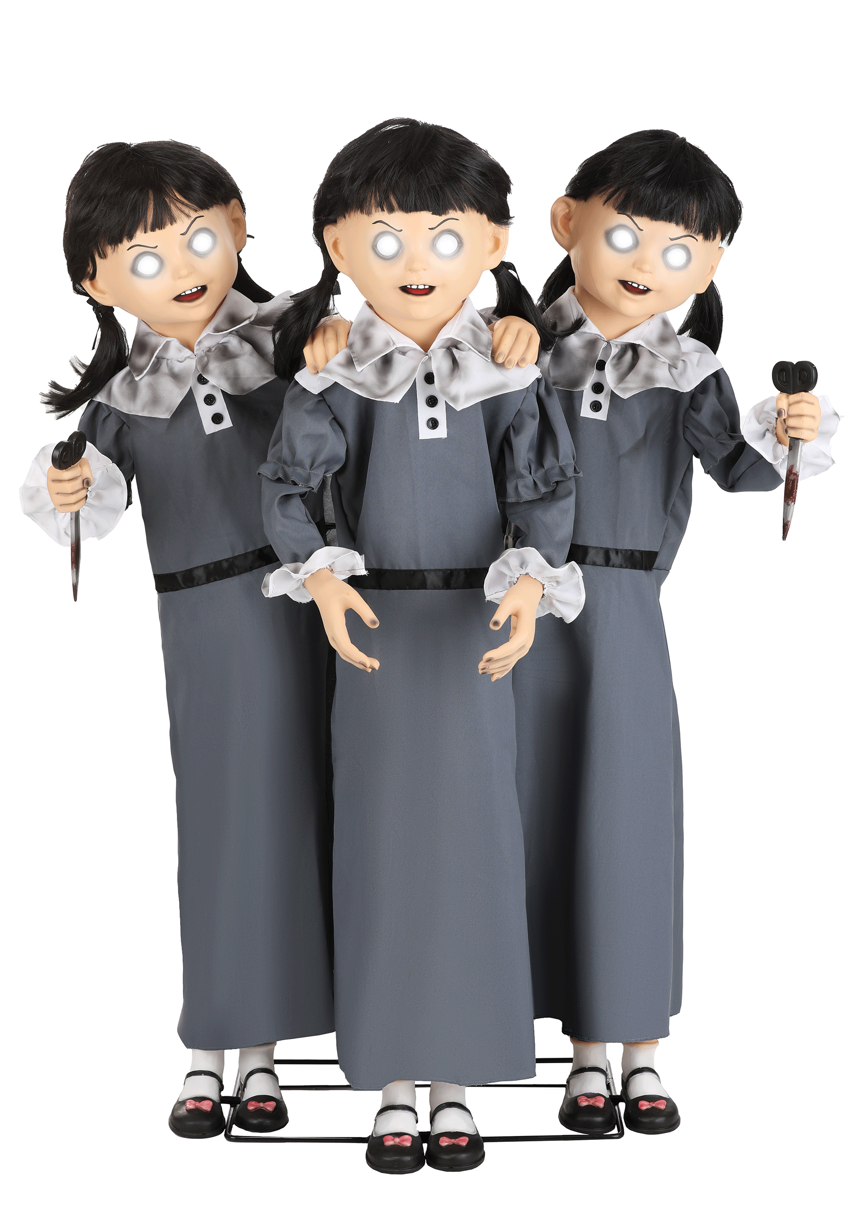 Crafted with eerie precision, this scary animatronic decoration stands approximately 4 feet tall and 30" wide. With a sturdy metal frame and detailed molded plastic features, these triplets come dressed to distress. Sound or a step pad triggers their light-up eyes and side-to-side moving heads, accompanied by chilling sounds. And fear not, setup is a breeze with the easy-to-follow instructions.
