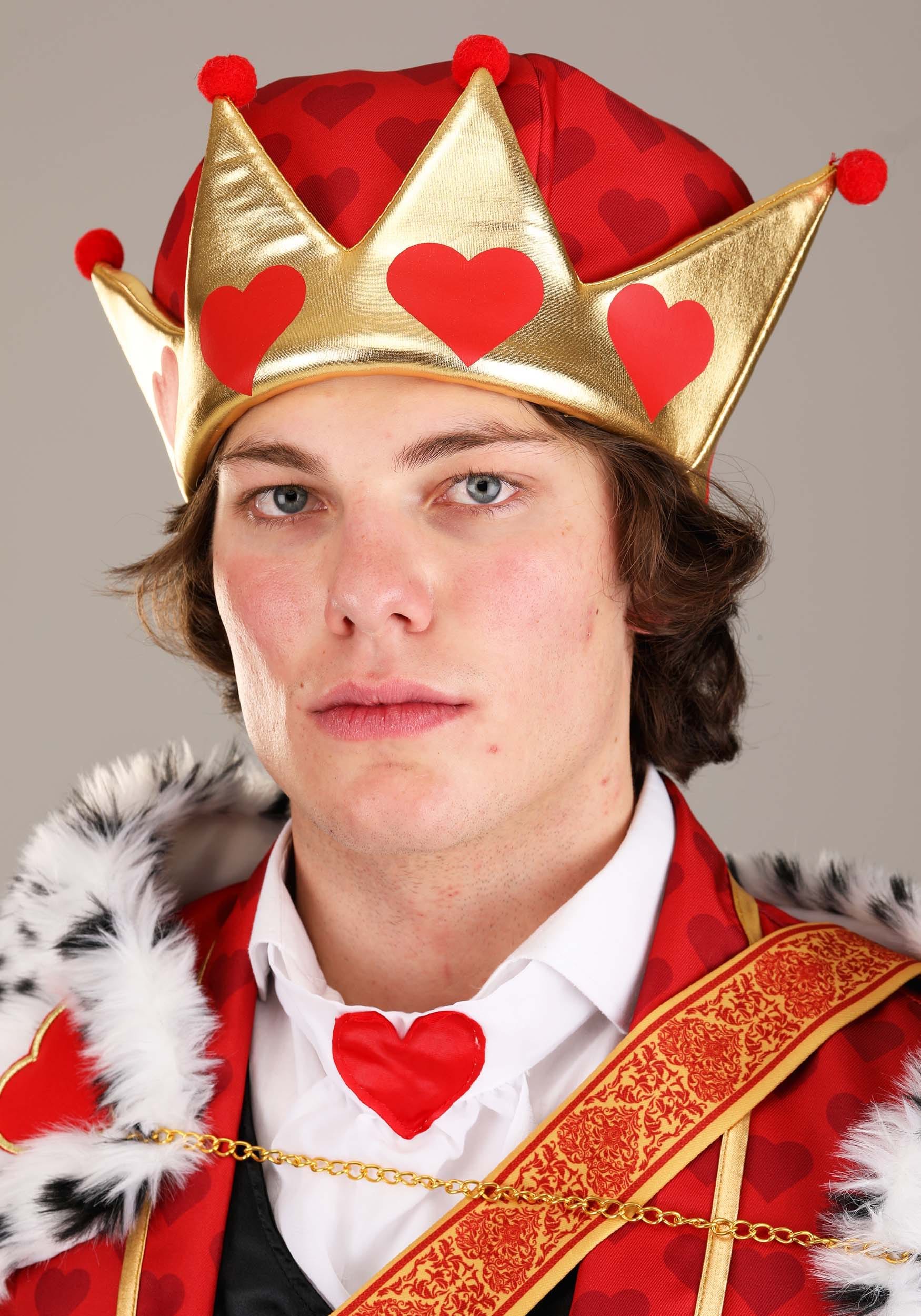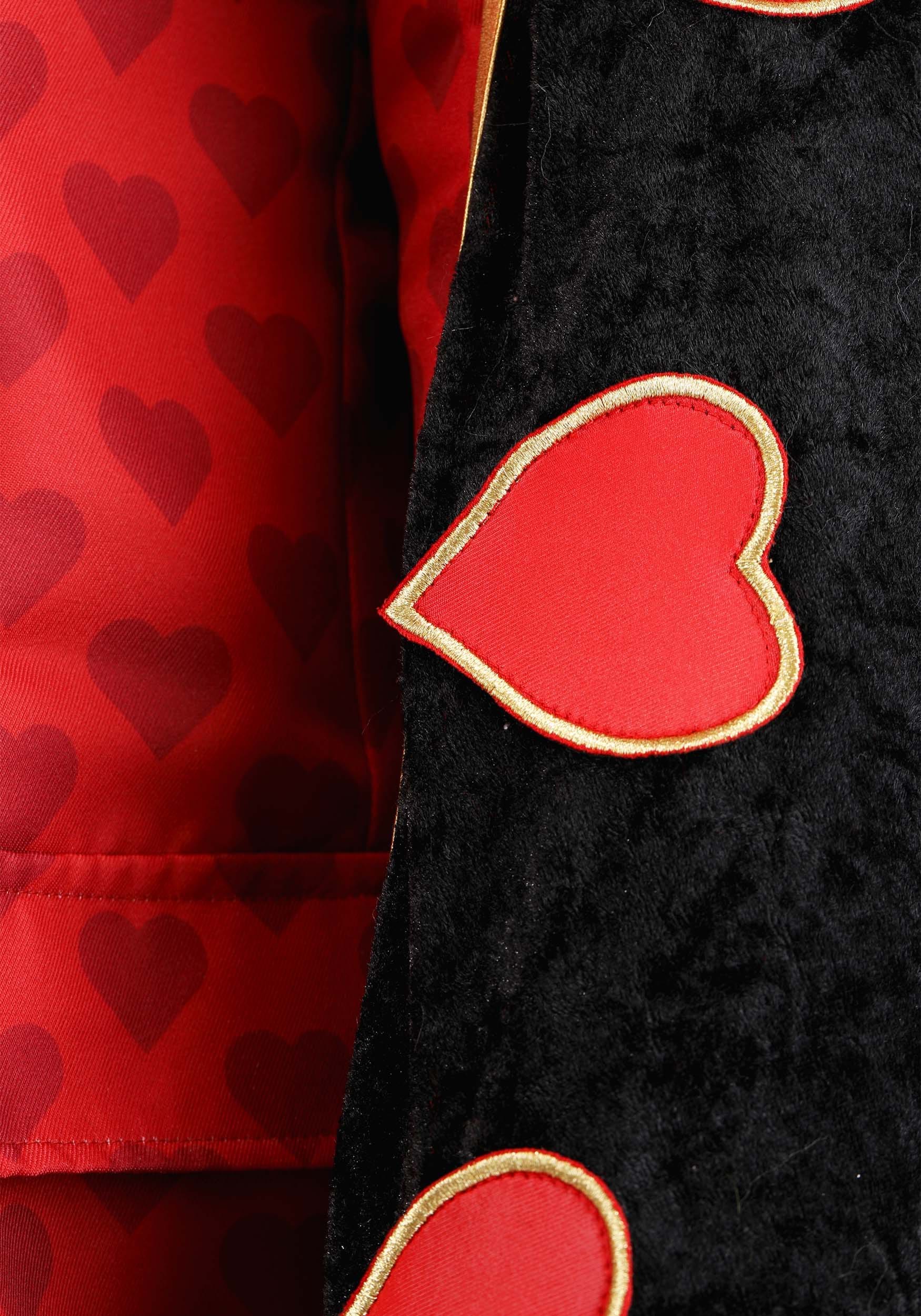 Be the most stylish sovereign in history when you wear your exclusive Premium King of Hearts Costume for Adults! The red twill jacket is patterned with hearts and edged with metallic gold binding. Its attached black satin vest panel fastens up the front behind printed red heart "buttons." The white chiffon dickey fastens behind your neck. The matching twill pants have a comfortable elastic waistband. Show that you're ready for court to begin by slipping on the gold-tone shoulder sash and the black velvet cape, and setting the foam-backed crown on your head!