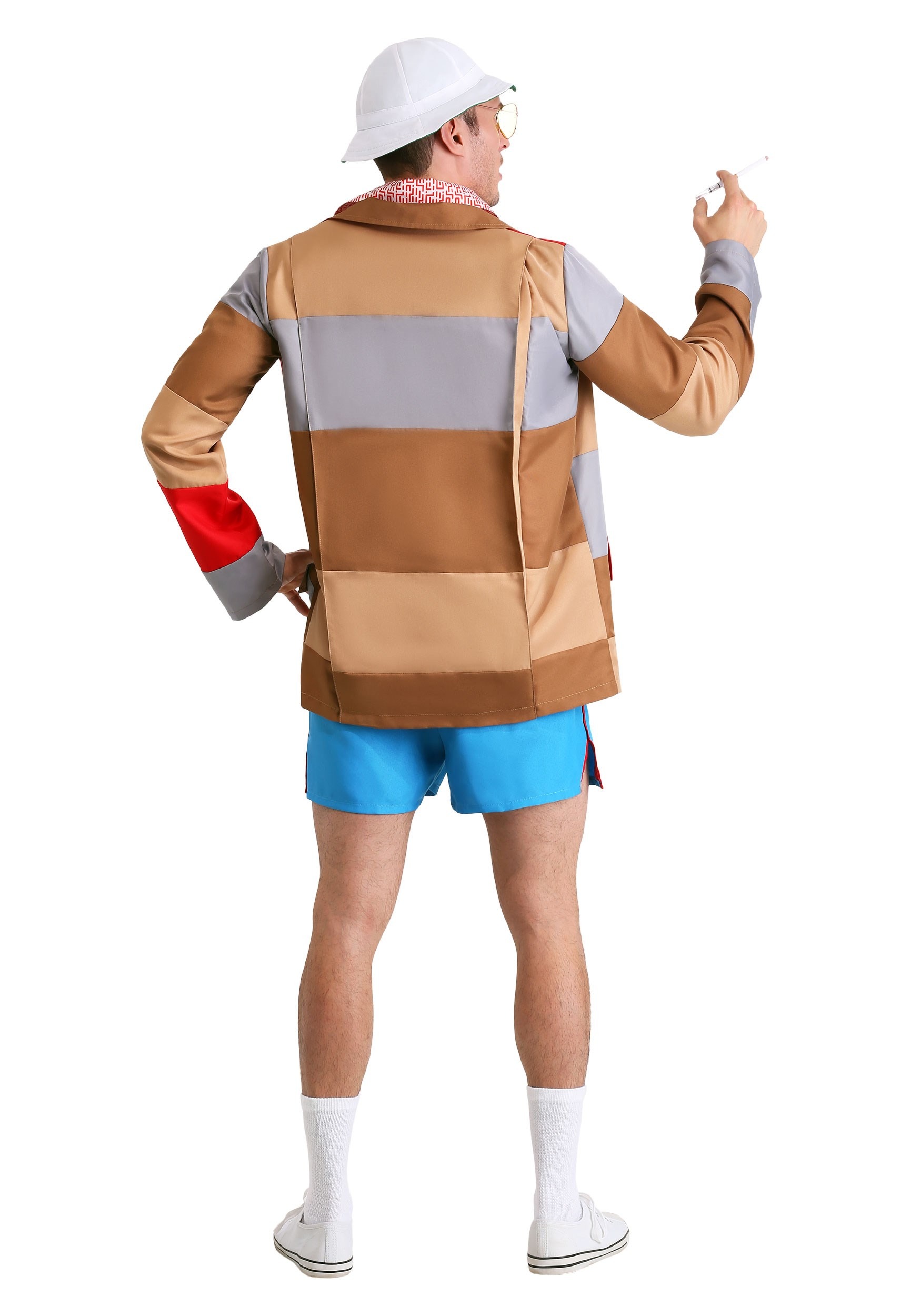 Inspired by the 1998 film, this Fear and Loathing in Las Vegas Raoul Duke Costume is a plus size version of his classic outfit. It comes with an orange and white pullover shirt with a deep v-neck. The blue shorts have a stripe down each side to match his 1970s getup. The patchwork jacket features a button-down front and has large cargo pockets for stowing away your personal possessions. The white bucket hat features a green interior. Bringing it all together are a pair of tinted sunglasses, just like the ones Duke wears, and a cigarette holder. Just make sure you bring along your lawyer if you plan on heading on a trip to Las Vegas in this outfit, because you're going to need tons of legal advice before the whole thing is through!
