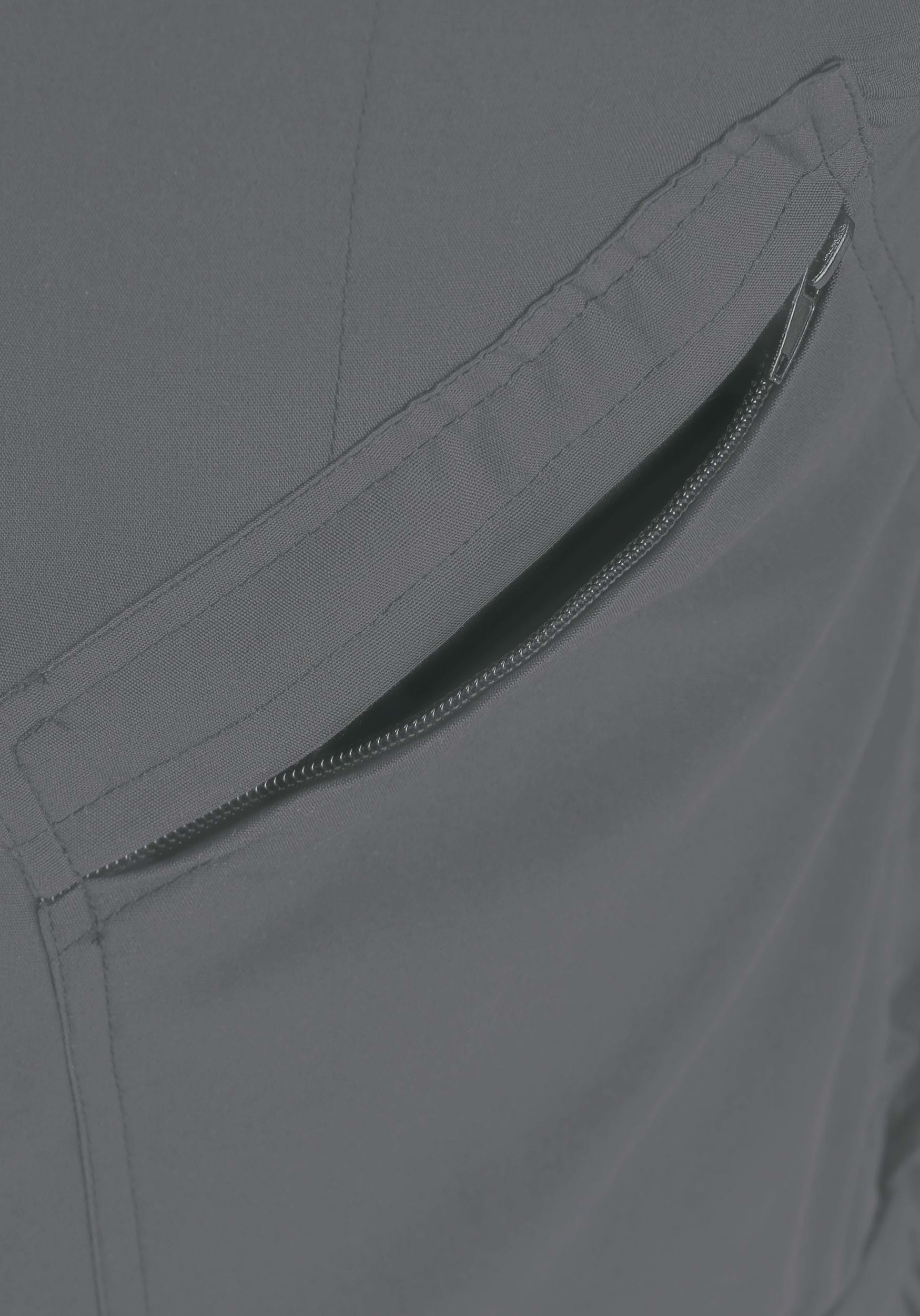 - Jumpsuit has front zipper closure and zippered pockets on front