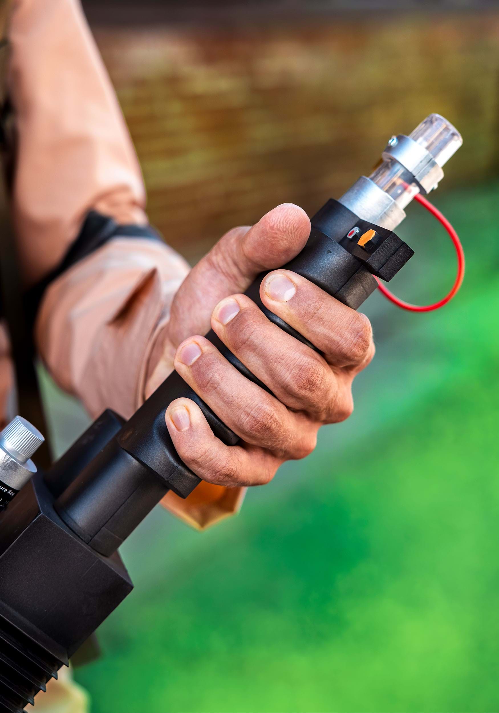 - When activated by push button on wand grip, pack lights up and makes movie realistic sounds
