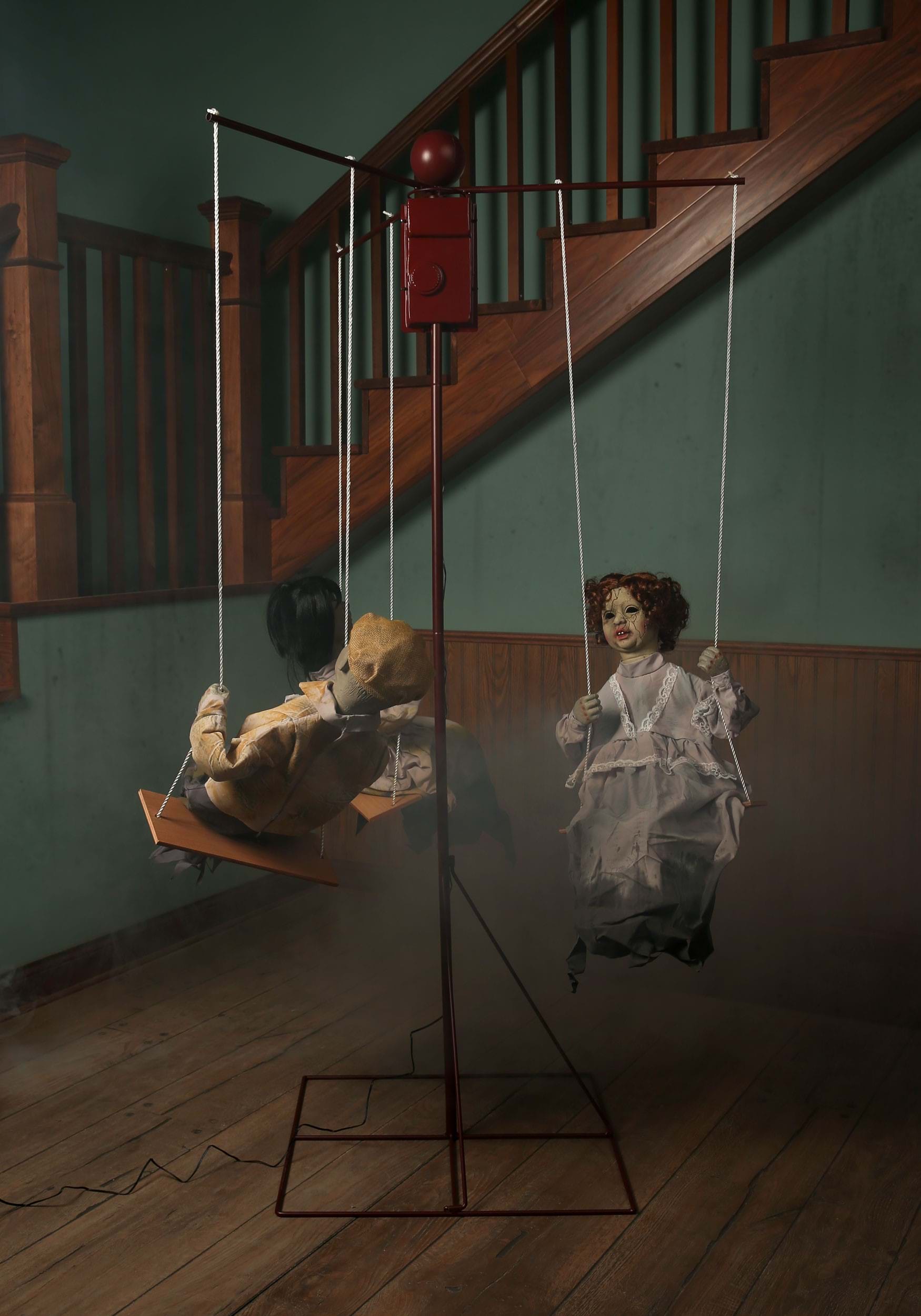Which is why we have decided to offer these ghostly dolls as a set, complete with swings, creepy looks, and the electronics along with it! The 6-foot-tall swing set spins gently around whenever someone activated the infrared sensor, which works in any lighting conditions. Don’t be too scared, though, or the dolls with sense it…