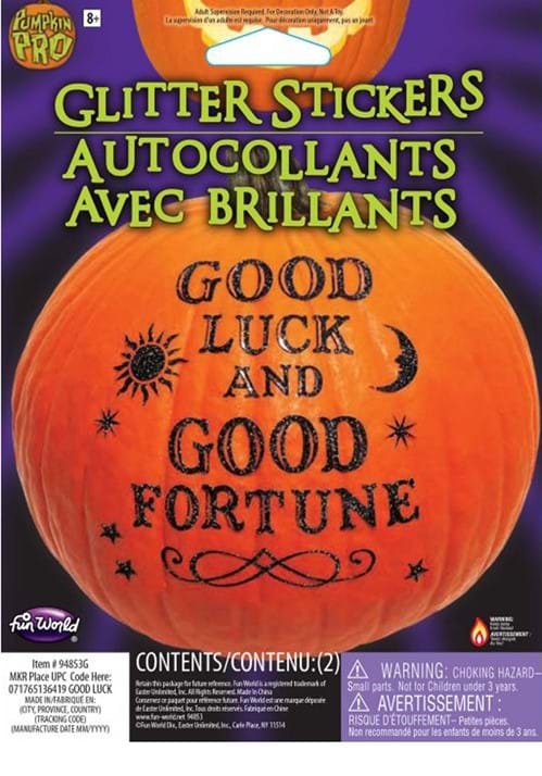 Create a magical atomsphere this Halloween by decorating your pumpkin with this Pumpkin Glitter Good Luck Sticker Kit! The DIY set includes stick-on decorations inthe shape of suns, moons, stars and curlicues, as well as the words "Good Luck and Good Fortune." Each sticker is made out of sparkly black material with adhesive backing.