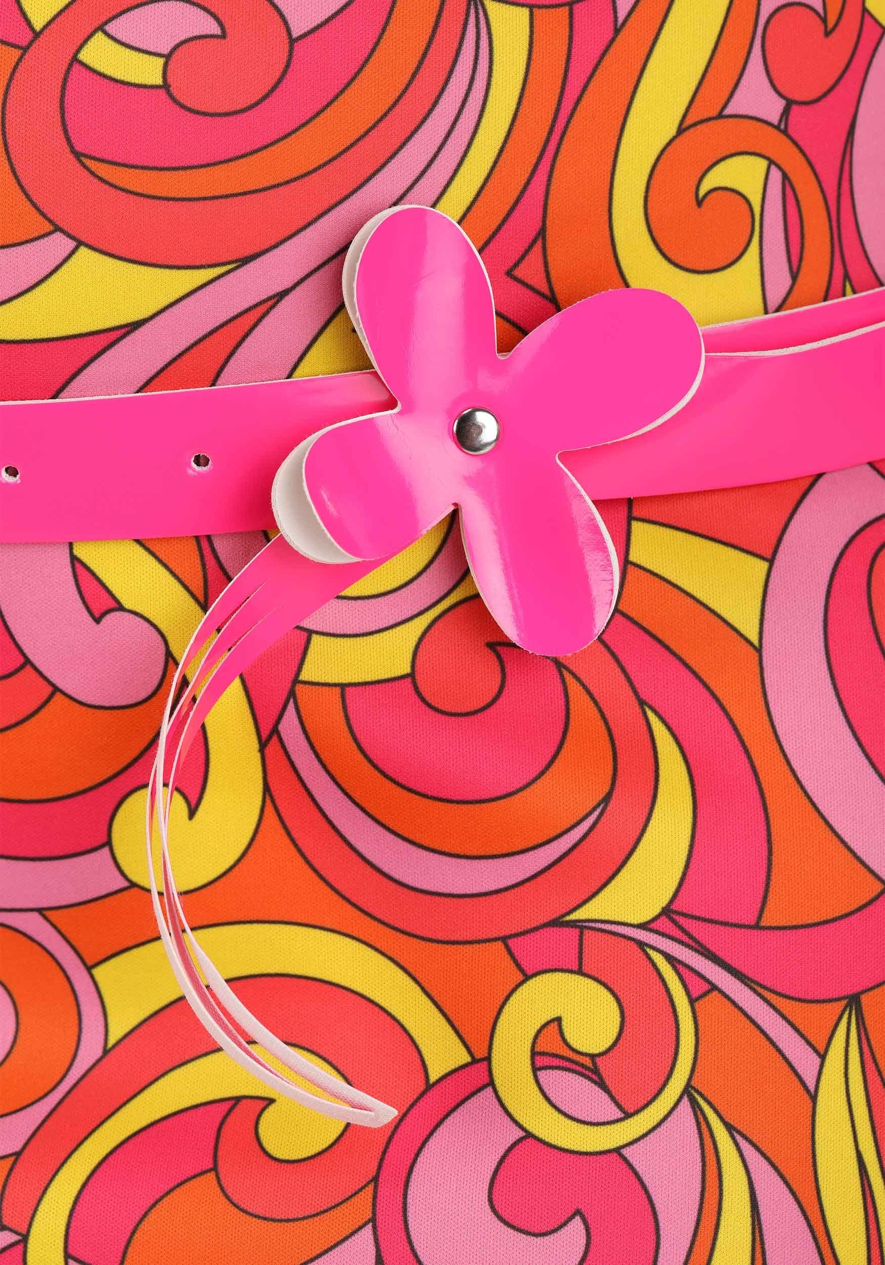 - Narrow hot pink faux leather belt has flower buckle, multiple notches