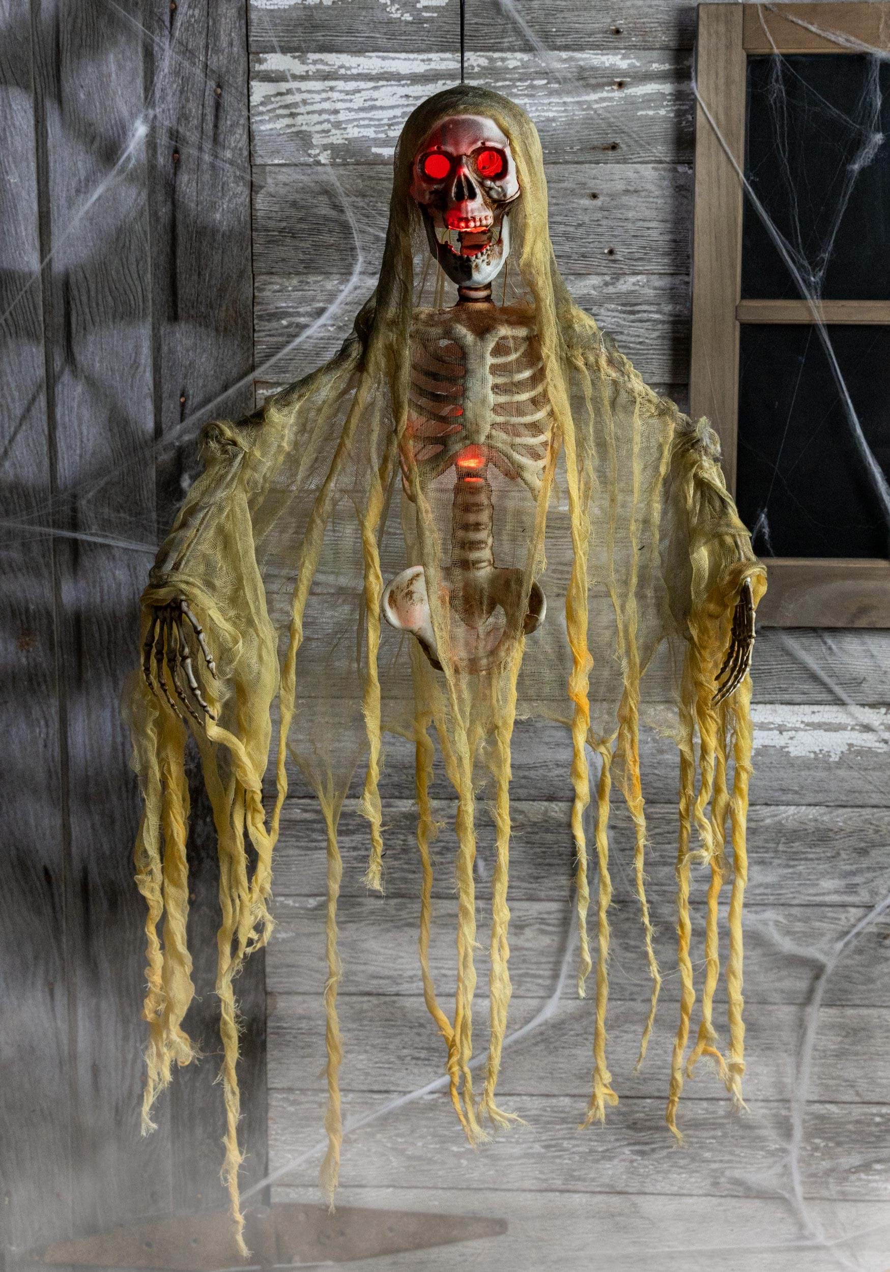 Place this exclusive Hanging Red Eye Skeleton on your porch or any other prominent area to get an ideally spooky ambiance for Halloween! The plastic prop is approximately twenty-three inches tall and is molded to look like the head, torso, and arms of a realistic skeleton. It's draped in yellow cheesecloth and its LED eyes flash red when activated. Use the attached cord loop for hanging purposes.