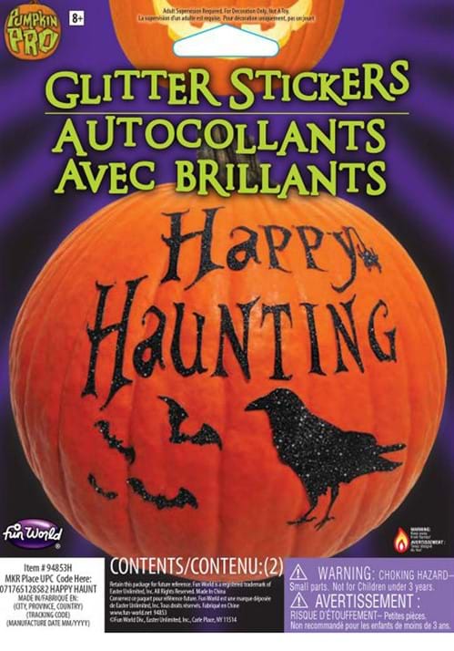 This Pumpkin Glitter Happy Haunting Sticker Kit is quick and painless for you and your pumpkin! The set includes several black bats, a black crow, and the words "Happy Haunting," all covered in sparkly glitter.