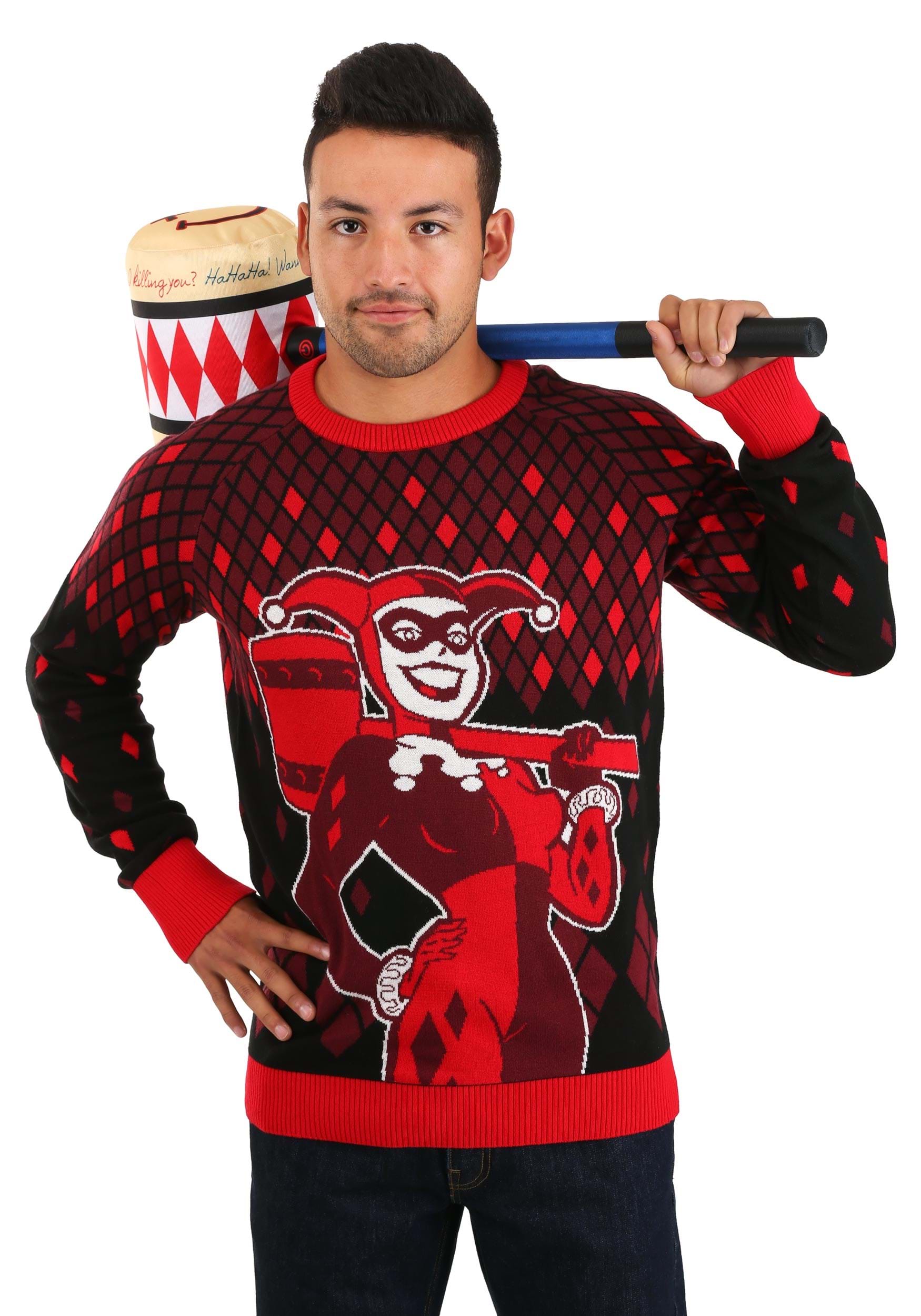 Add a little excitement to your holiday celebrations with this officially licensed Adult Harley Quinn Hammer Time Ugly Christmas Sweater! The cozy knit top has ribbed knit edging around the neck, wrists, and hem, and features an image of a beaming Harley Quinn superimposed on a festive diamond-patterned background. Of course she has her hammer, too - you never know when you might need to stir up a little trouble at the office Christmas party.
