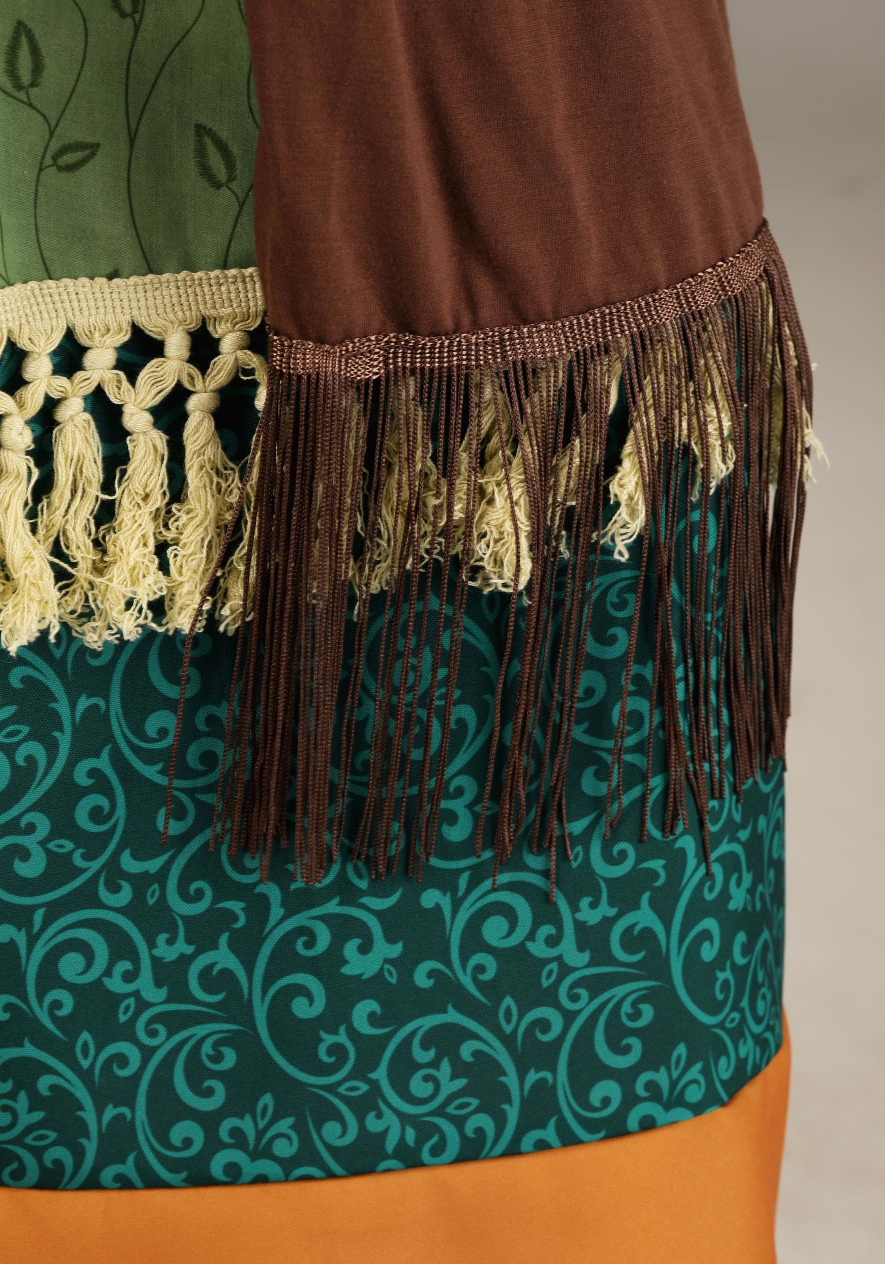 Peer into the future when you wear this exclusive, officially licensed Harry Potter Deluxe Plus Size Professor Trelawney Costume for Women! The long broadcloth dress buttons at the front and is printed all over with a pattern of vines and leaves that resemble embroidery stitchwork. The long poplin skirt has a comfortable elastic waistband and three different-colored hem bands. A sleeveless jersey knit vest slides on over the dress and features a fringed hem. Pull your hair back with the headband so that it won't impede your view of the tea leaves, and slip on the plastic eyeglasses to finish your outfit!
