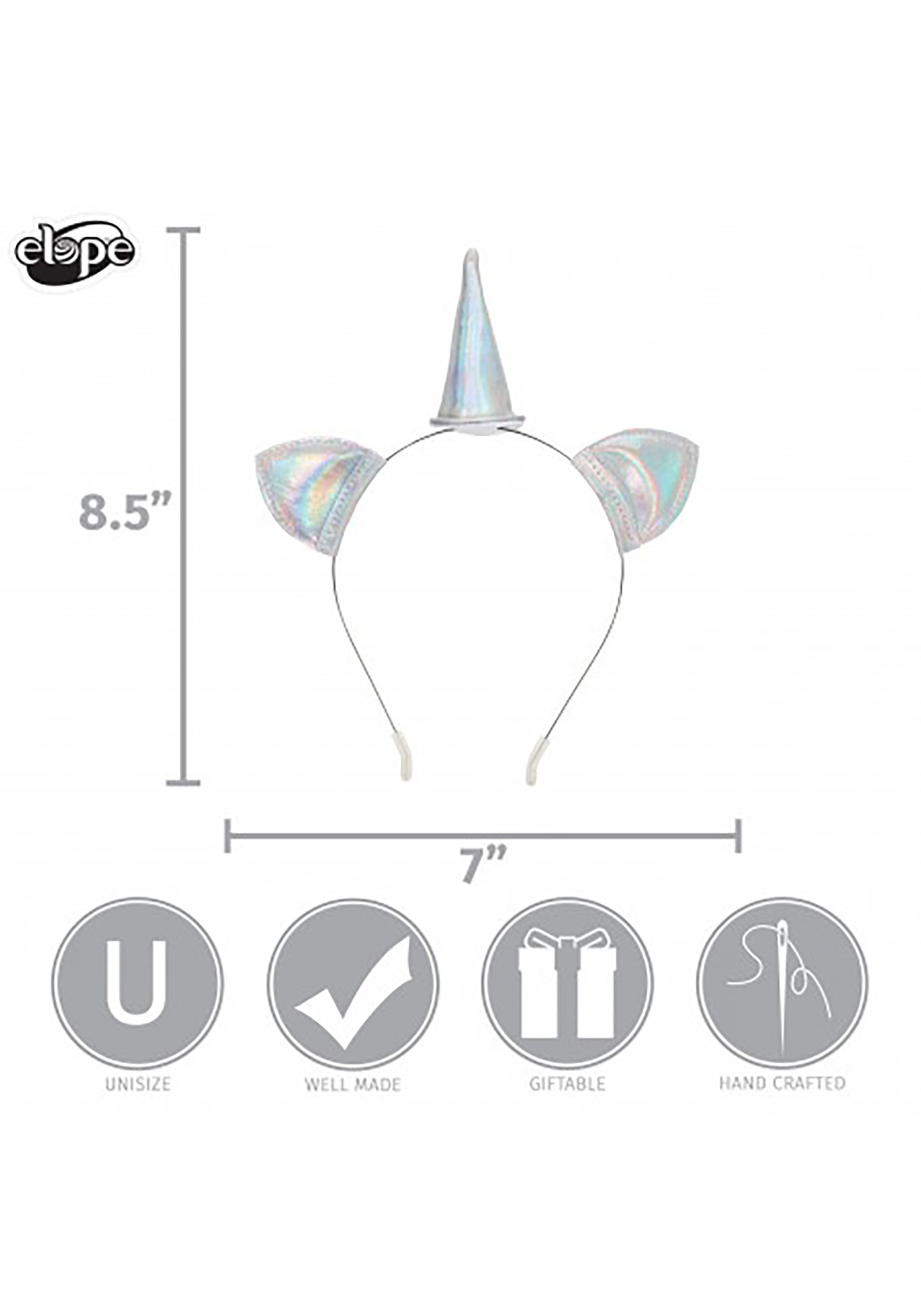 Embrace the mystical allure of unicorns with our Holographic Mini Unicorn Costume Headband! This Halloween, step into a world of fantasy and enchantment with an accessory that's sure to turn heads. Made from 100% polyester metallic knit, this headband glimmers with a holographic sheen, capturing the essence of these magical creatures. Its iridescent silver ears and a plush, cone-shaped horn sparkle brilliantly, making you feel like you've emerged from a storybook.