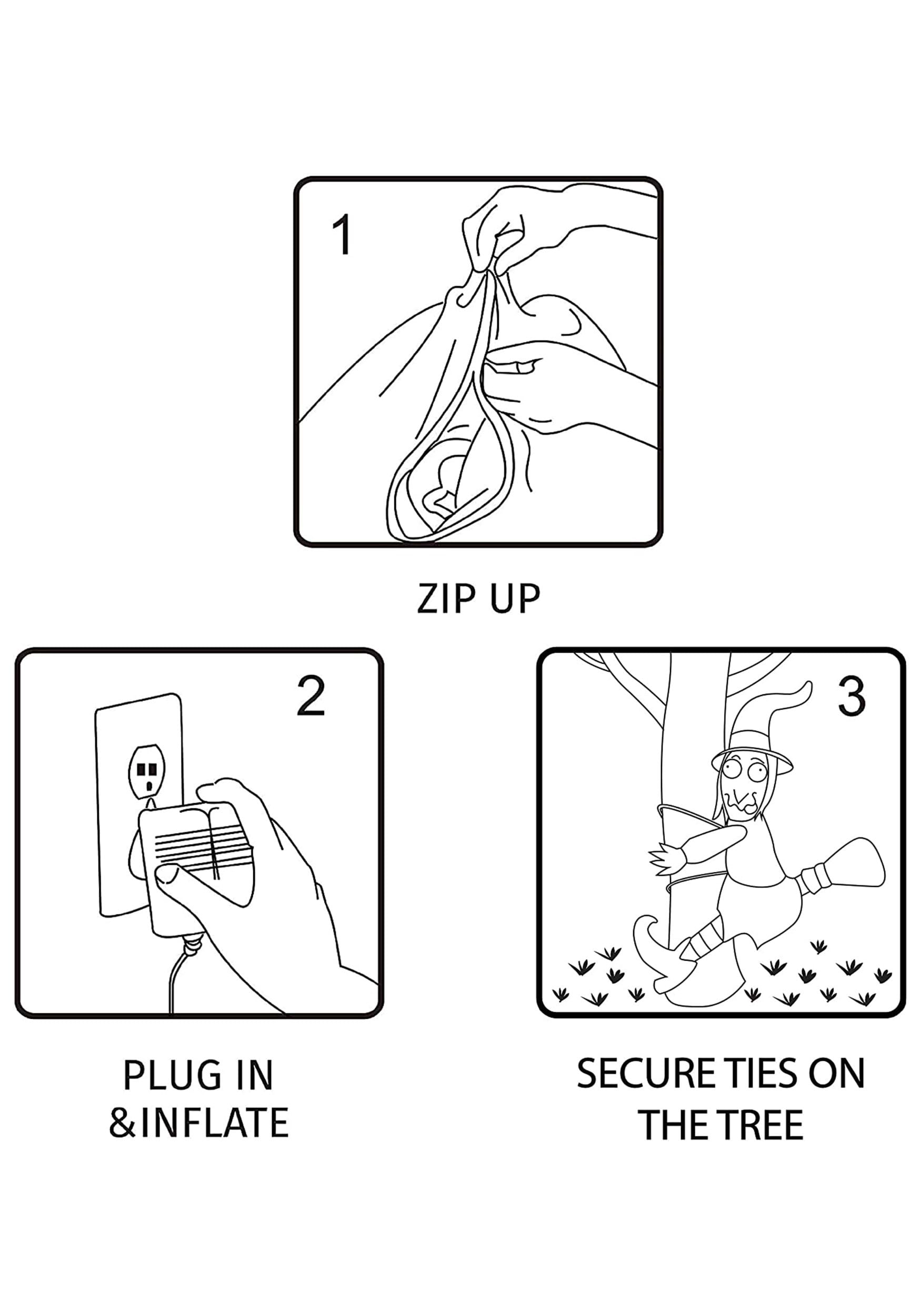 This green-faced witch loses a bit of her wickedness as a result of this goof up. Her face is dazed and her body is distorted in a perfect position to secure to a tree outside your home, using the included ties. She's wearing classic purple and black striped tights and curled-toe witch shoes, as well as the iconic witch's hat. The broom end sticks out in the back. Simply zip this inflatable up, plug it in, then take it outside—no spells required. Trust us, she'll be an instant hit this Halloween!