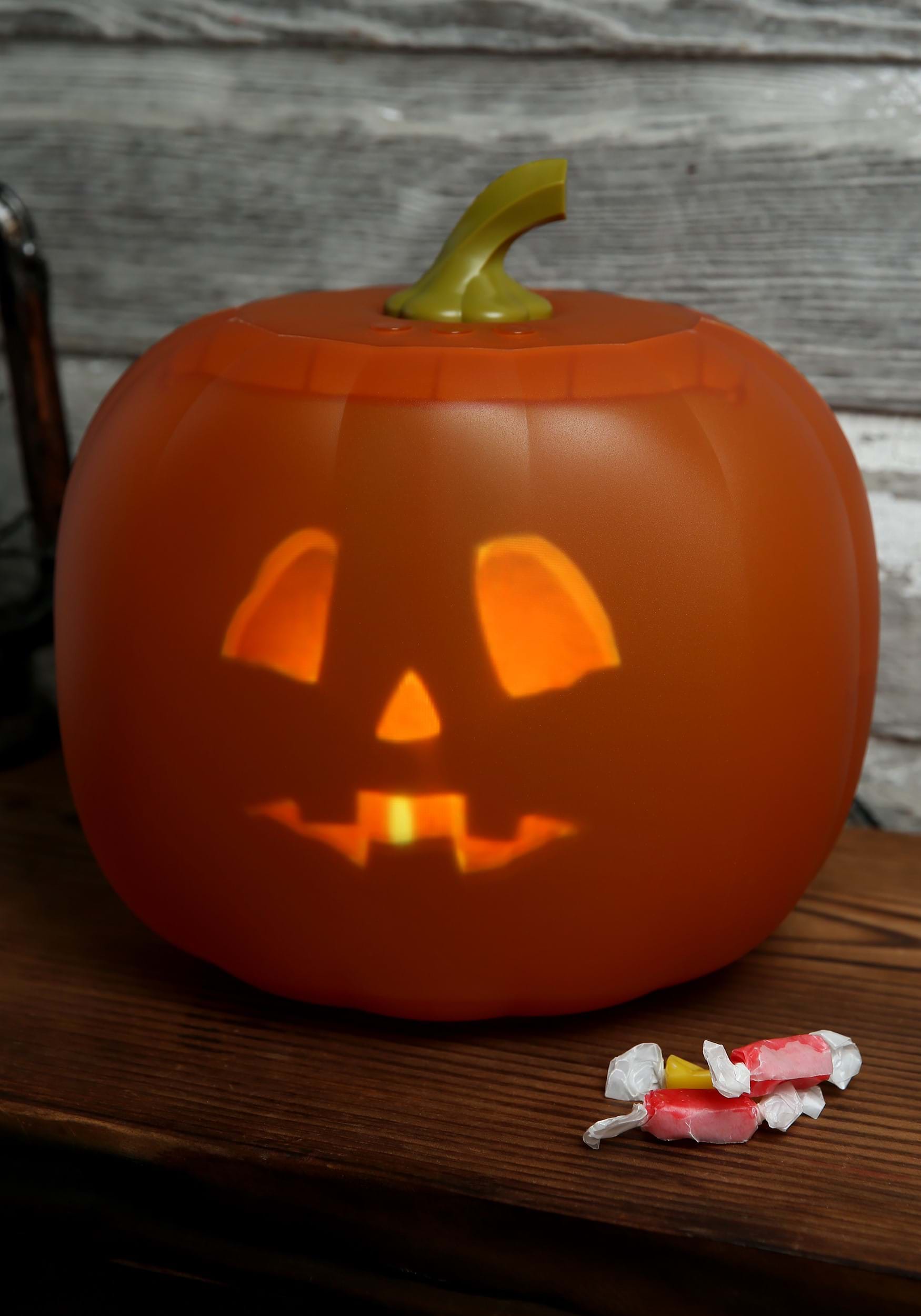 Jabberin' Jack has a projector on the interior that runs three different animated faces. No need to carve or add a candle, just plug him in and watch him come to life! He sings, tells "bad" Halloween jokes, and greets trick-or-treaters. Hit the skip mode to get to scarier P-G-rated pumpkin personas. Hit it again and the jack-o-lantern will tell all the dad jokes. The final mode is the musical mode with original Jack-o-lantern songs. The cord is two feet long and runs the projector lights and built-in speaker. Be sure and display this gourd in a place he won't get wet. Light-weight and unique, this pumpkin is sure to be the "king" of your Halloween decor!
