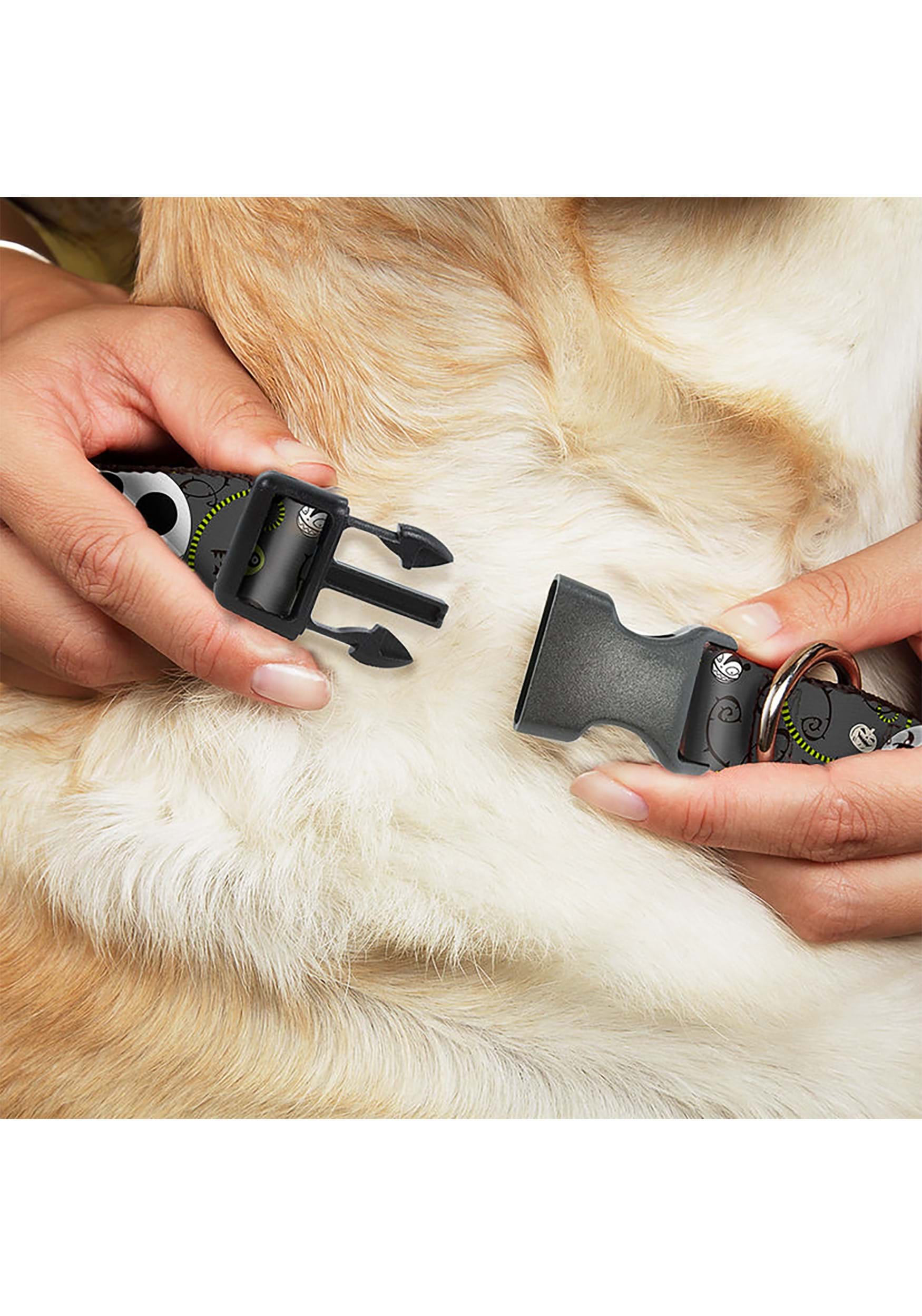 Halloween comes but once a year--but love for The Nightmare Before Christmas is a year-round obsession! Decorate your favorite Zero with this Jack Skellington Plastic Clip Dog Collar. The dark gray background is printed with Jack's face and detailed with other iconic NBC details. The metal D-ring is for clipping a leash (did you see we have matching leashes?) so your best friend will stay close at the dog park or as you explore Halloween Town. The parachute plastic clip won't pinch fingers or fur, and is easy to wipe clean if you've got a messy pup. And it's fully adjustable to fit a variety of pooches.