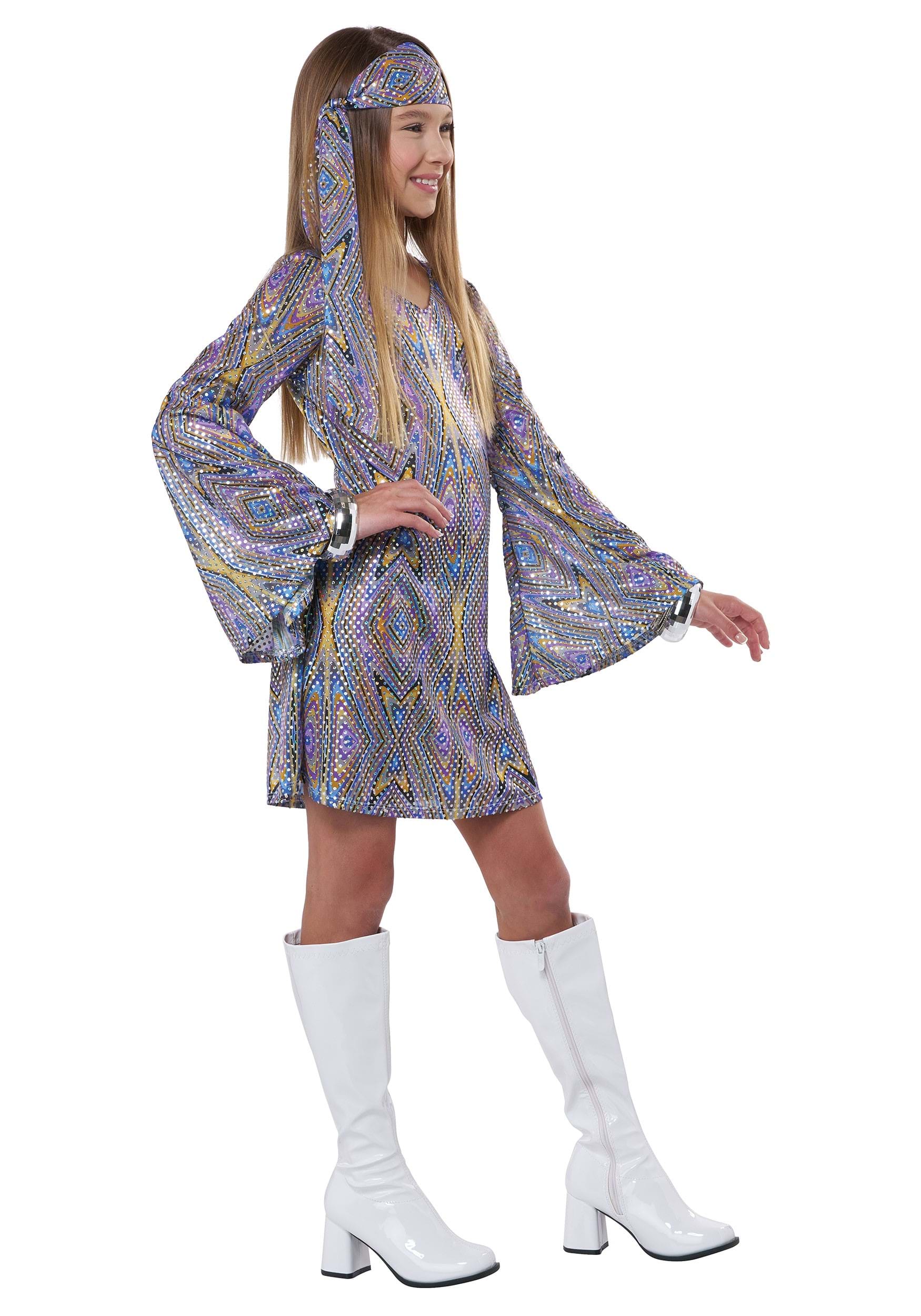 Engage in some Freaky Friday transformations by gifting your gal with this Child Disco Darling costume. She’ll love the shimmering design of this fantastic sequined interlock fabric and pullover minidress, perfect for the groovy setting with a V-neck and long bell sleeves. Wrap the matching scarf around neck, waist, or head to complete the look of the Dancing Queen of yesteryear brought into the modern age. Bring the ‘70s out of the attic and prove that Donna Summer was right: Disco will survive!