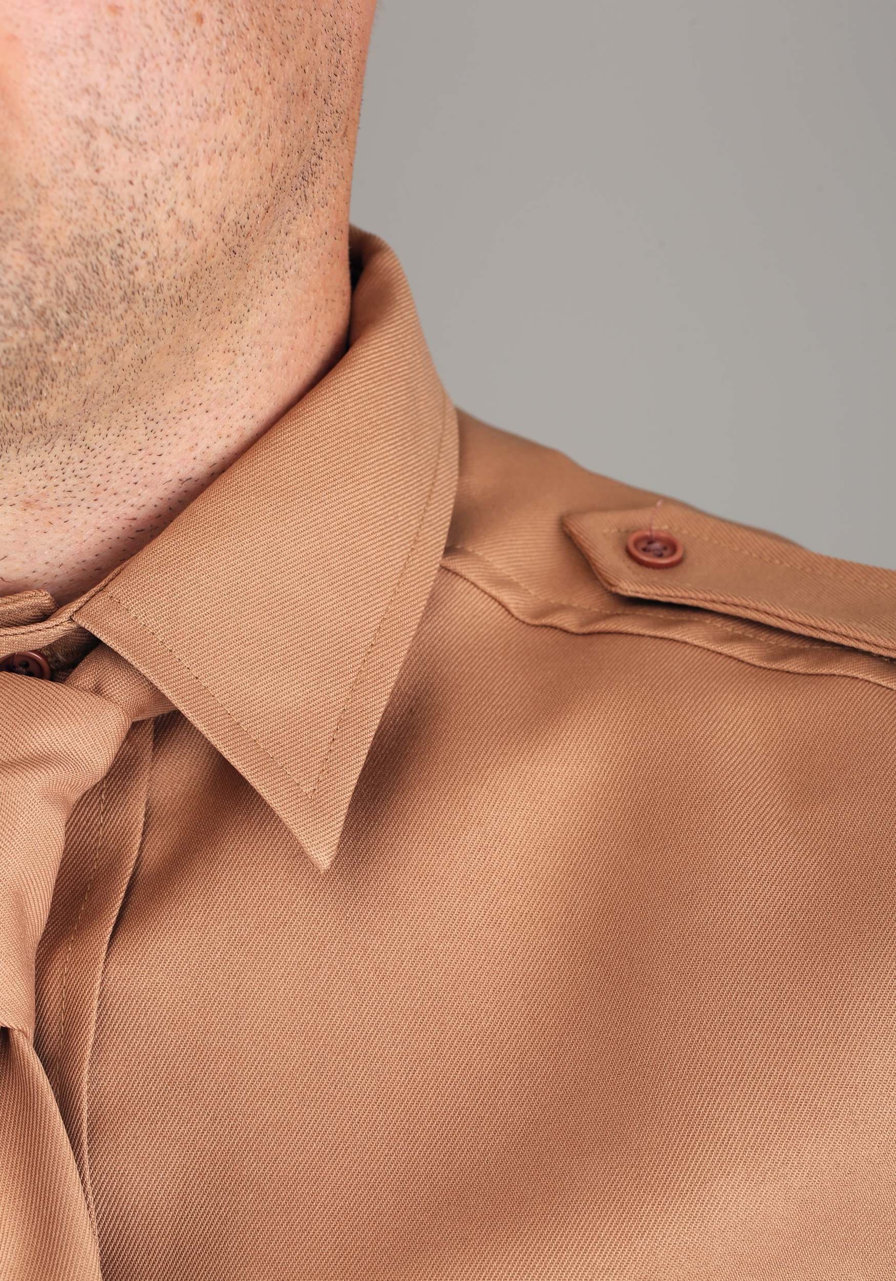 - Non stretch polyester blend collared shirt has buttons down center front, buttons and sleeve cuffs and shoulders, chest pockets with button closures