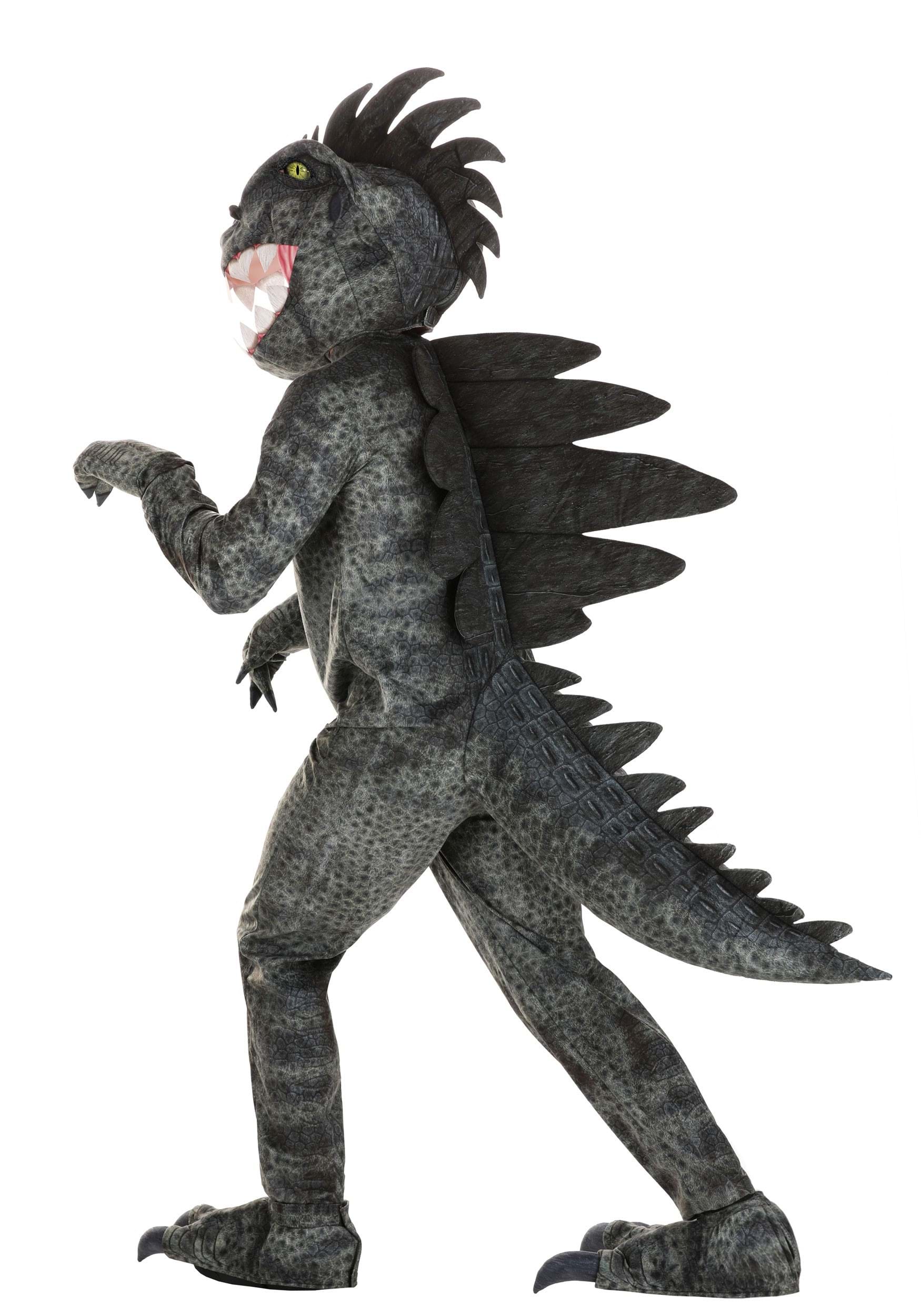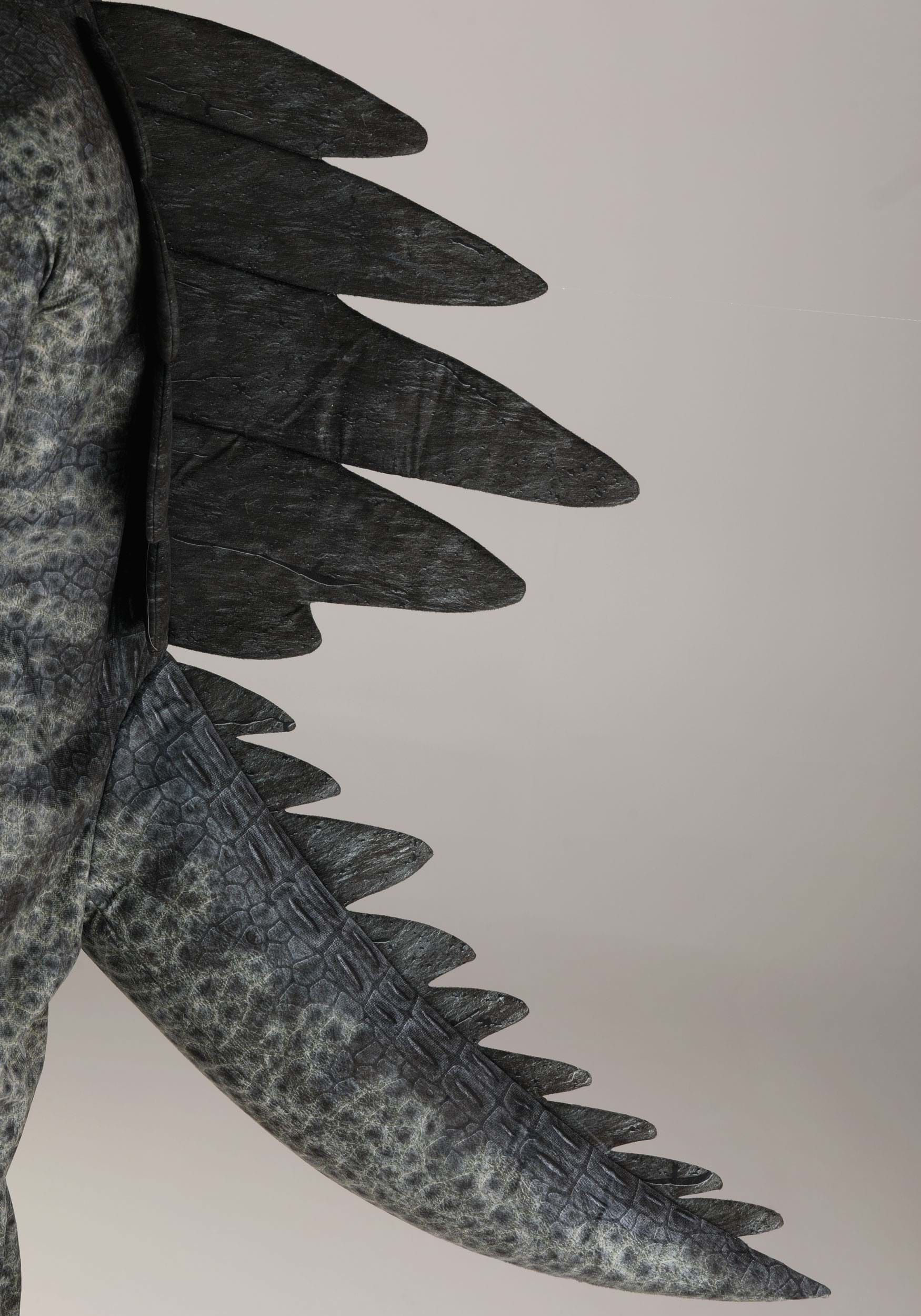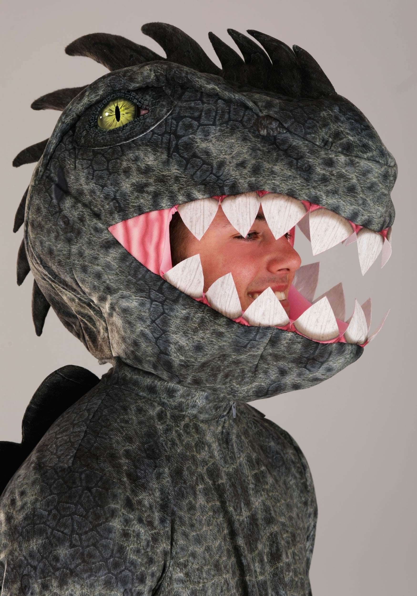 The design is made by one of our awesome in-house artists who totally loves dinosaurs. The jumpsuit and headpiece look super realistic, with cool foam spikes sewn down the back and a big, fiber-filled tail that swings around when you walk. The gloves are foam-backed and slide on easily, so your hands look like dino claws. And the headpiece – oh man, it’s the best part! It has felt teeth and fiber filling, making it look like a real dinosaur head, and it secures with a hook and loop fastener, so it stays put.