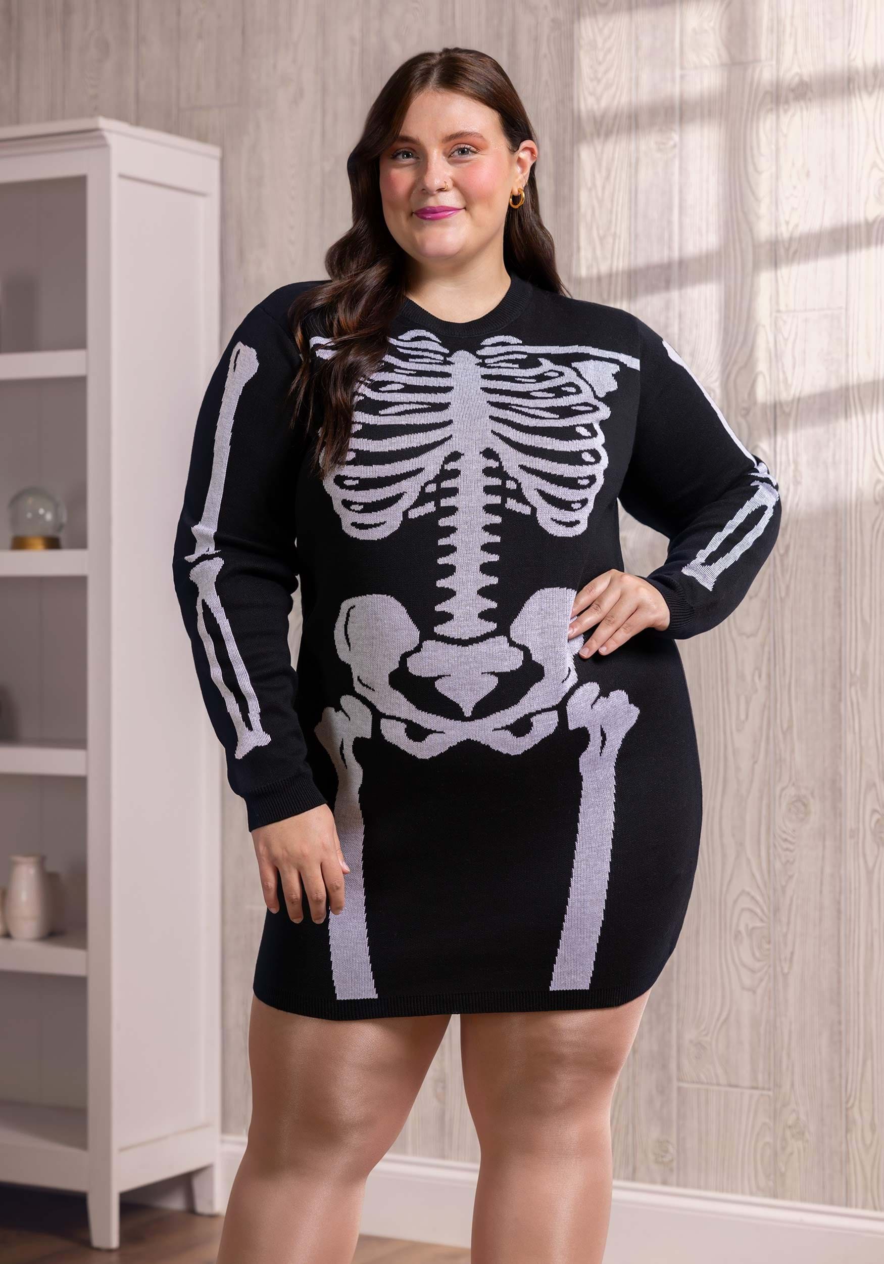 Show off your love for Halloween LBD-style! This exclusive Skeleton Sweater Dress for Women pulls on voer your head and is styled in a comfortable, relaxed fit. Rib knit material trims the neck, the sleeve cuffs, and the miniskirt's hemline. The long sleeves feature knitted-in graphics of white arm bones and dress body is decorated with knitted-in images of a ribcage, spine, pelvic bones, and upper femurs.