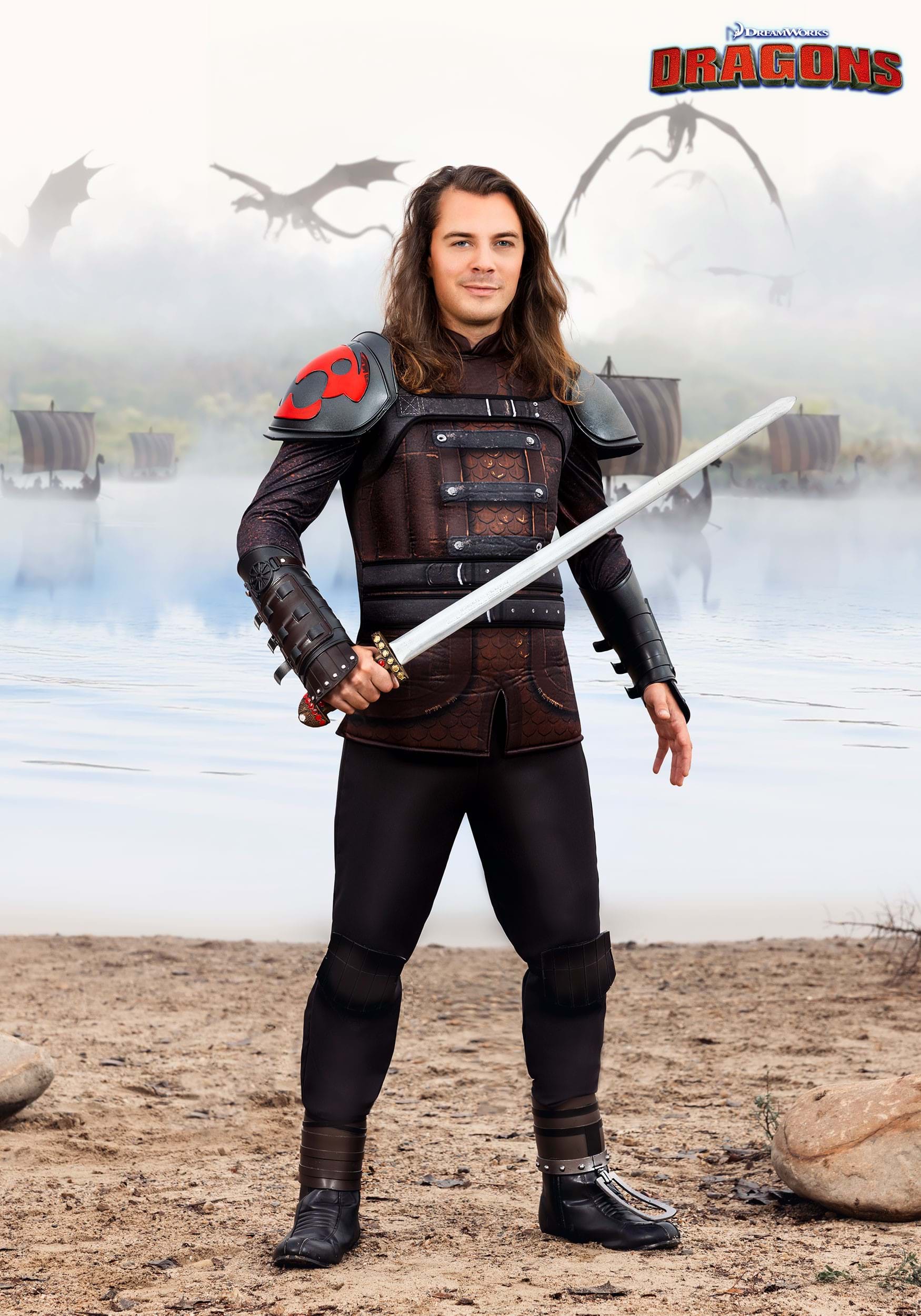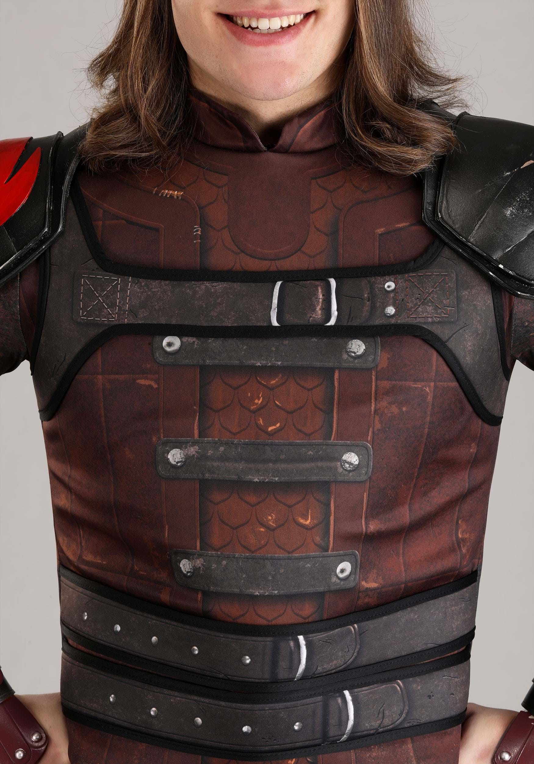 The centerpiece, a robust tunic top, is adorned with printed details mimicking Hiccup's rugged armor. Look closely, and you'll see the attention to detail, designed to withstand the fiercest of imaginary dragon battles. Attached shoulder pads elevate the hero's silhouette, one boasting a proud red dragon symbol, signaling your allegiance to the dragon cause.