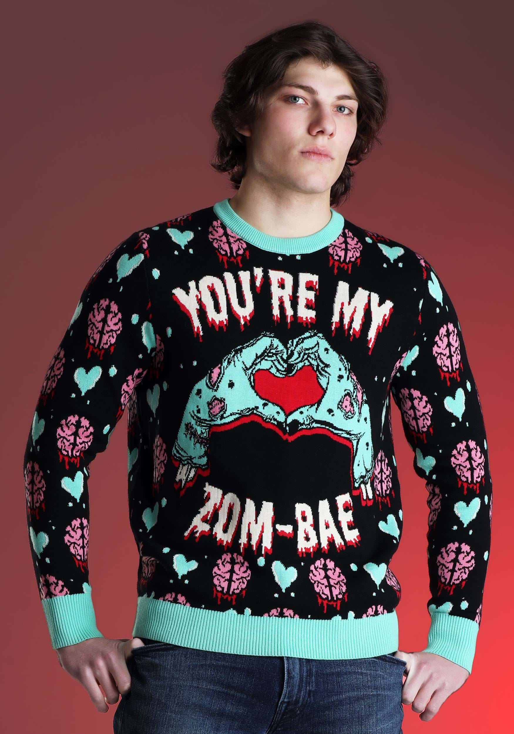 There are sweet songs about Valentine’s, thrilling songs about zombies, and even songs that croon about both! But it’s been a feat and a half to express your love for the decaying monsters and February’s sweetest holiday in any adequate way. You tried for Halloween one year. But zombie cupid’s arrow didn’t fly quite as accurately as intended. Getting dolled up for a Valentine’s date but wearing tattered zombie clothing made getting into the restaurant a bit tricky. And the reverse was even worse. Zombie makeup is best left for pub crawls and haunted houses, it seems. Luckily, we have this You’re My Zom-Bae Valentine’s Day Sweater that’s sure to make your heart sing!
