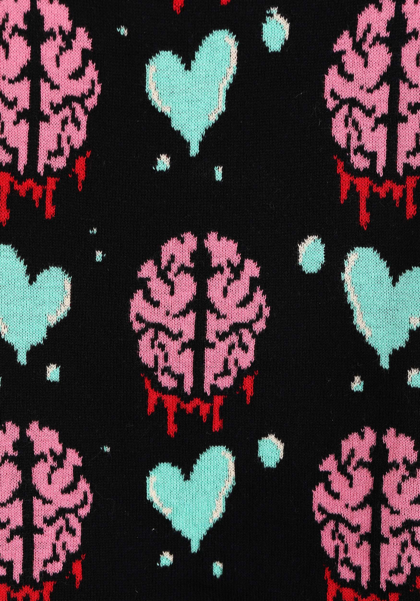 This Made By Us exclusive takes to seemingly opposite ideas and combines them into one great romance! The black pullover features an all-over knit pattern of icy blue hearts and bright pink brains. A larger graphic across the front of the sweater shows a pair of zombie hands forming a heart and is surrounded by the words “You’re My Zom-Bae.” The black and pastel color palette works to bring thoughts of candy to mind, while the unique artwork perfectly captures the elusive goal of celebrating both love and zombies!