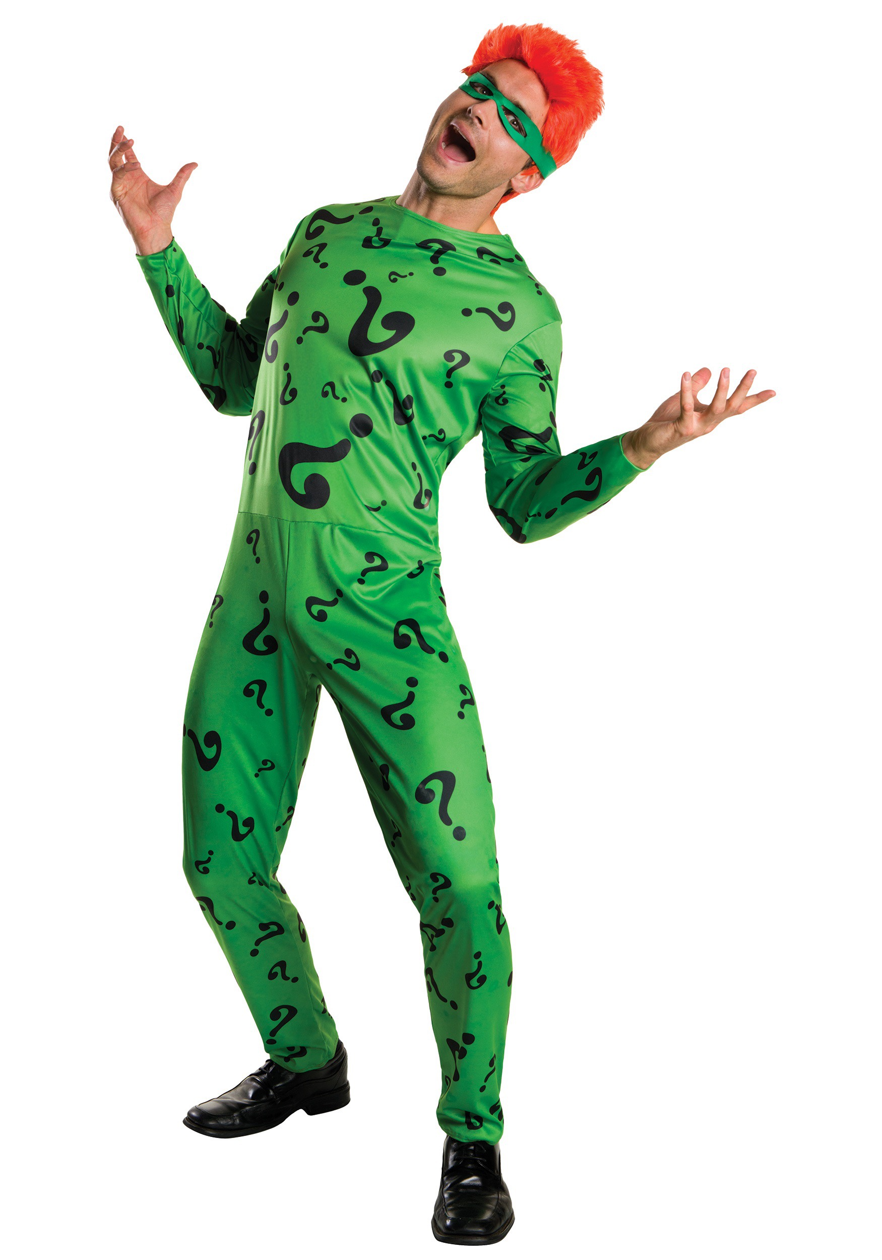 This classic Batman Riddler costume is perfect for Halloween—especially for a group costume! The costume includes everything you need for the look that’s straight out of Batman Forever. The 100% polyester jumpsuit is the classic green color and has black question marks printed all over it. The polyfoam mask ensures that you keep your true identity a secret. Don’t forget to add the Riddler wig—he wouldn’t be the Riddler without his signature red hair! Team up with other Batman super villains for a group costume that’s sure to get attention this Halloween!