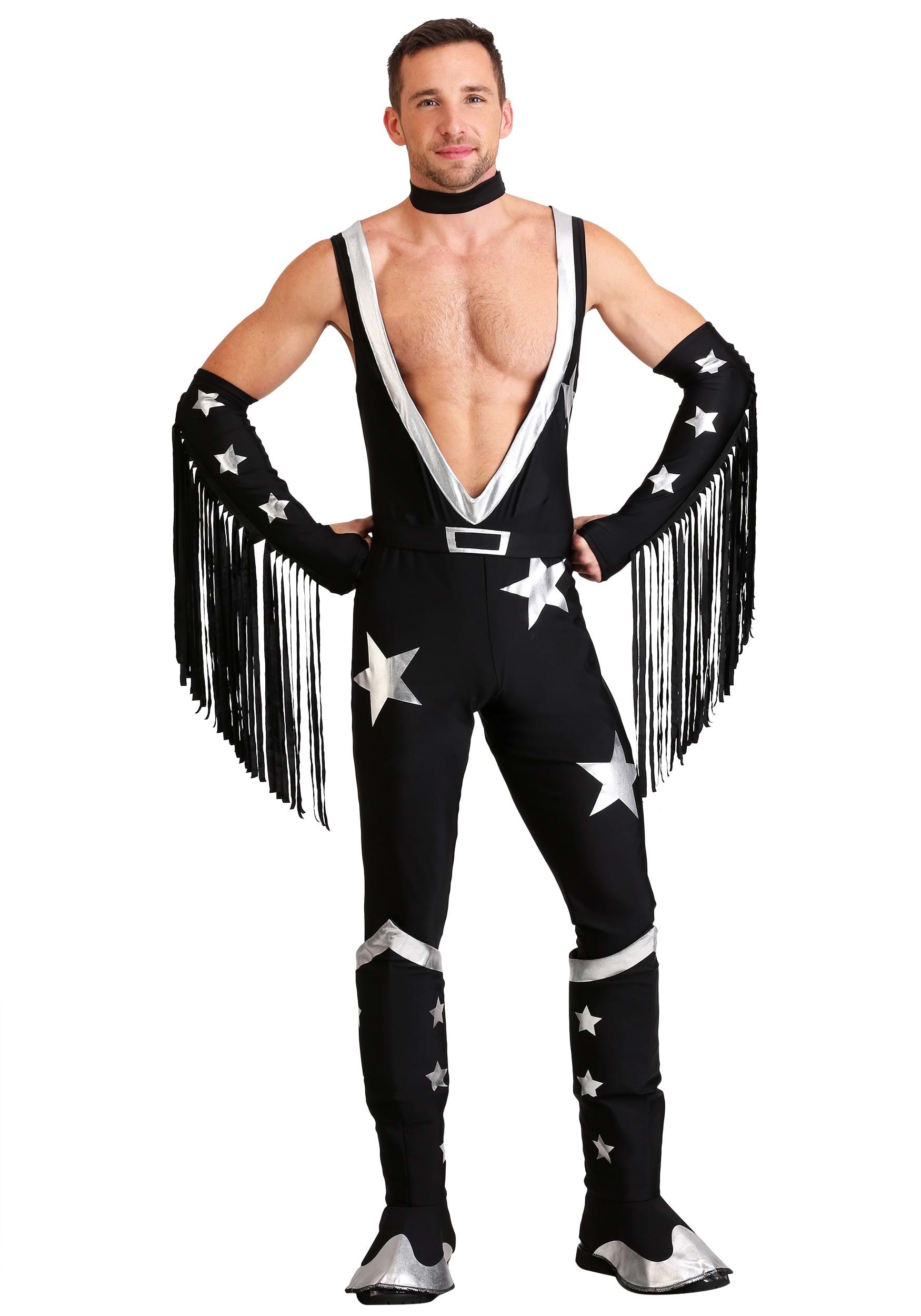 This officially licensed costume comes with a jet black jumpsuit that comes with plenty of silver accents. The deep v-neck style helps for optimum rocking conditions and the silver stars on the legs help give you a stage-stealing presence. It also comes with matching black gauntlets with star designs and black fringe. The boot covers continue the look with matching silver stars on the side. Top the look off by adding one of our KISS makeup kits and you'll be ready to take to the stage as one of the greatest guitar legends of all time.