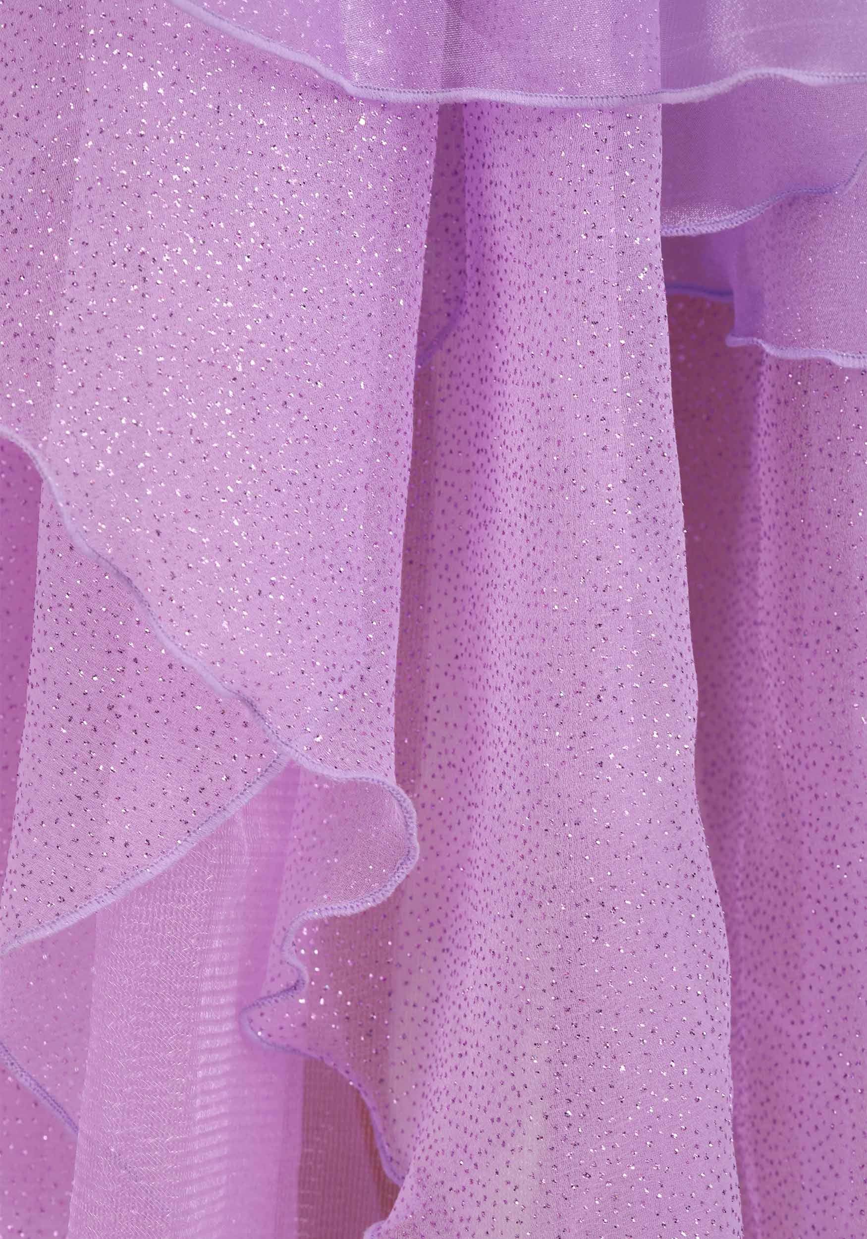 - Satin bodice front has glittery mesh overlay, off shoulder ruffles, front waistline ruffle