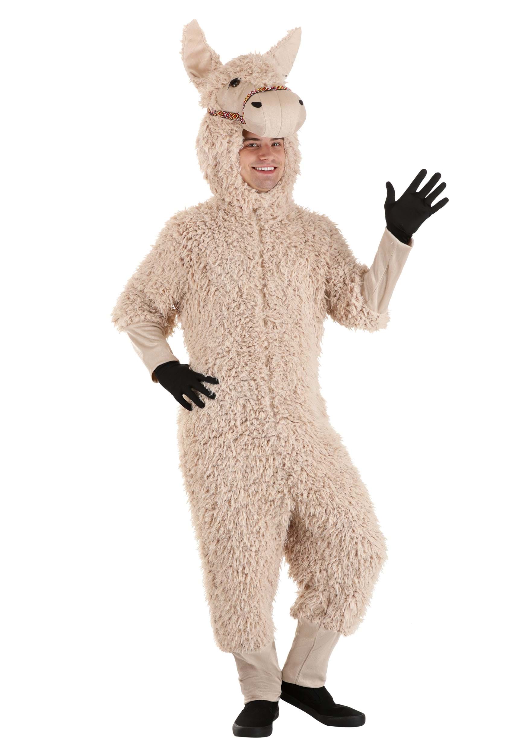 Be as chill or as dramatic as you want in this exclusive Llama Costume for Adults! The unisex jumpsuit zips up the front to make putting it on quick and easy. It's made of soft and shaggy long-pile faux fur. The arm bands and leg bottoms are made of soft minky fabric that's the same soft beige shade as the faux fur. The included headpiece fastens under the chin and is decorated with long, pointed ears, a fiber-filled muzzle, brown "halter" details, and embroidered eyes and nostrils.