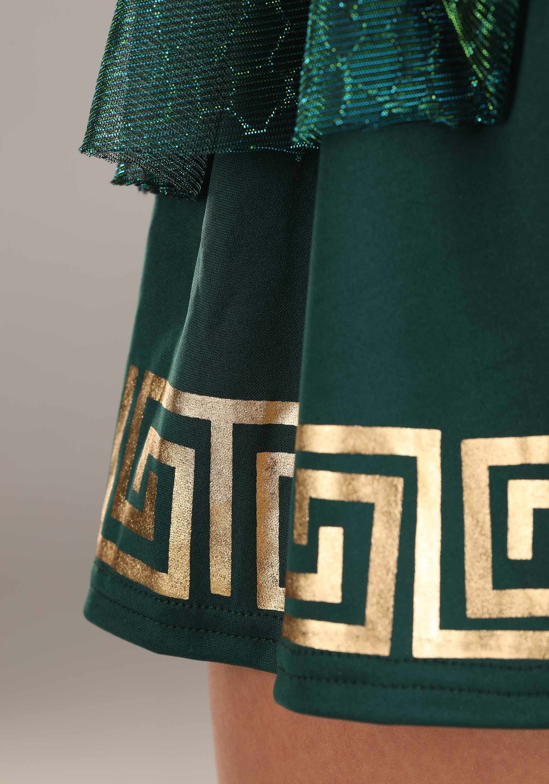 - Main body: 100% polyester, Drape: 50% polyester, 50% metallic jersey knit, metallic mesh, and faux snakeskin fabrics