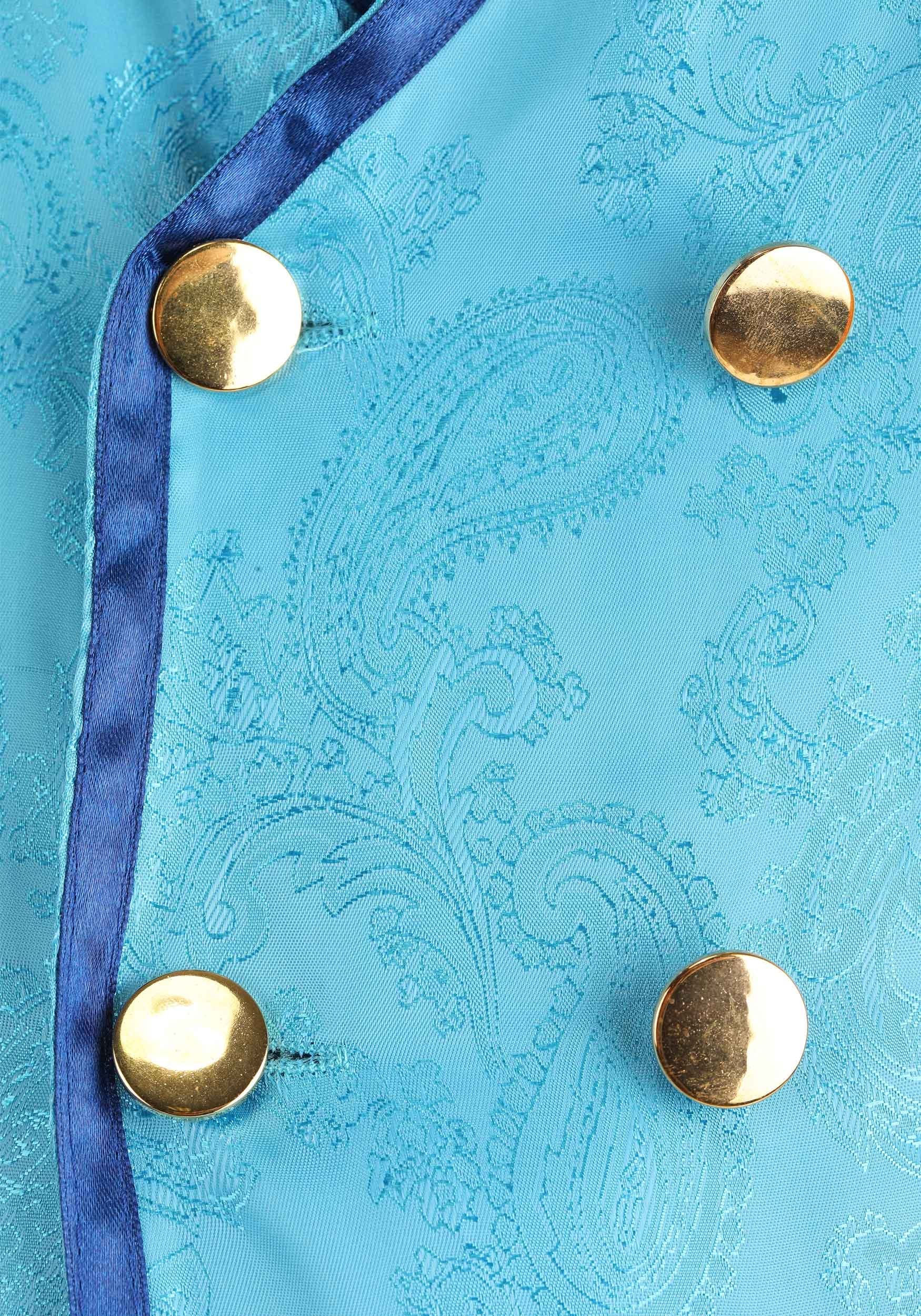 - Frock coat jacket has ribbon edging, decorative metal buttons