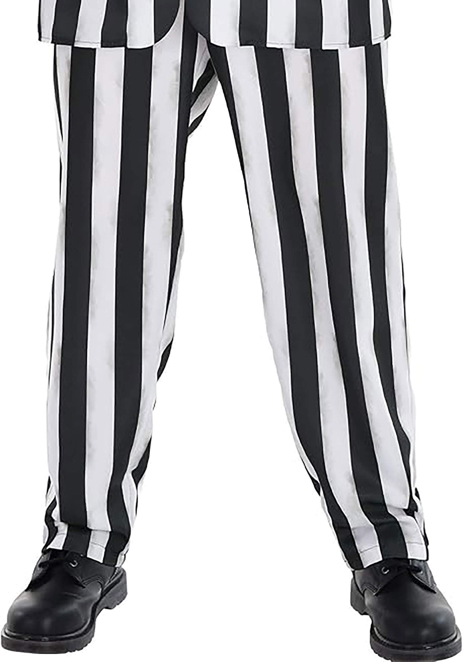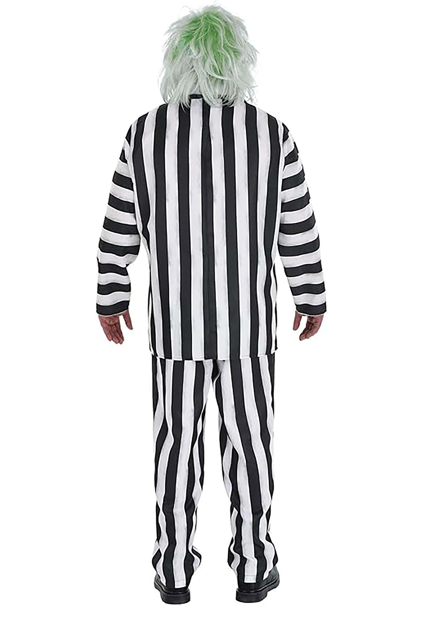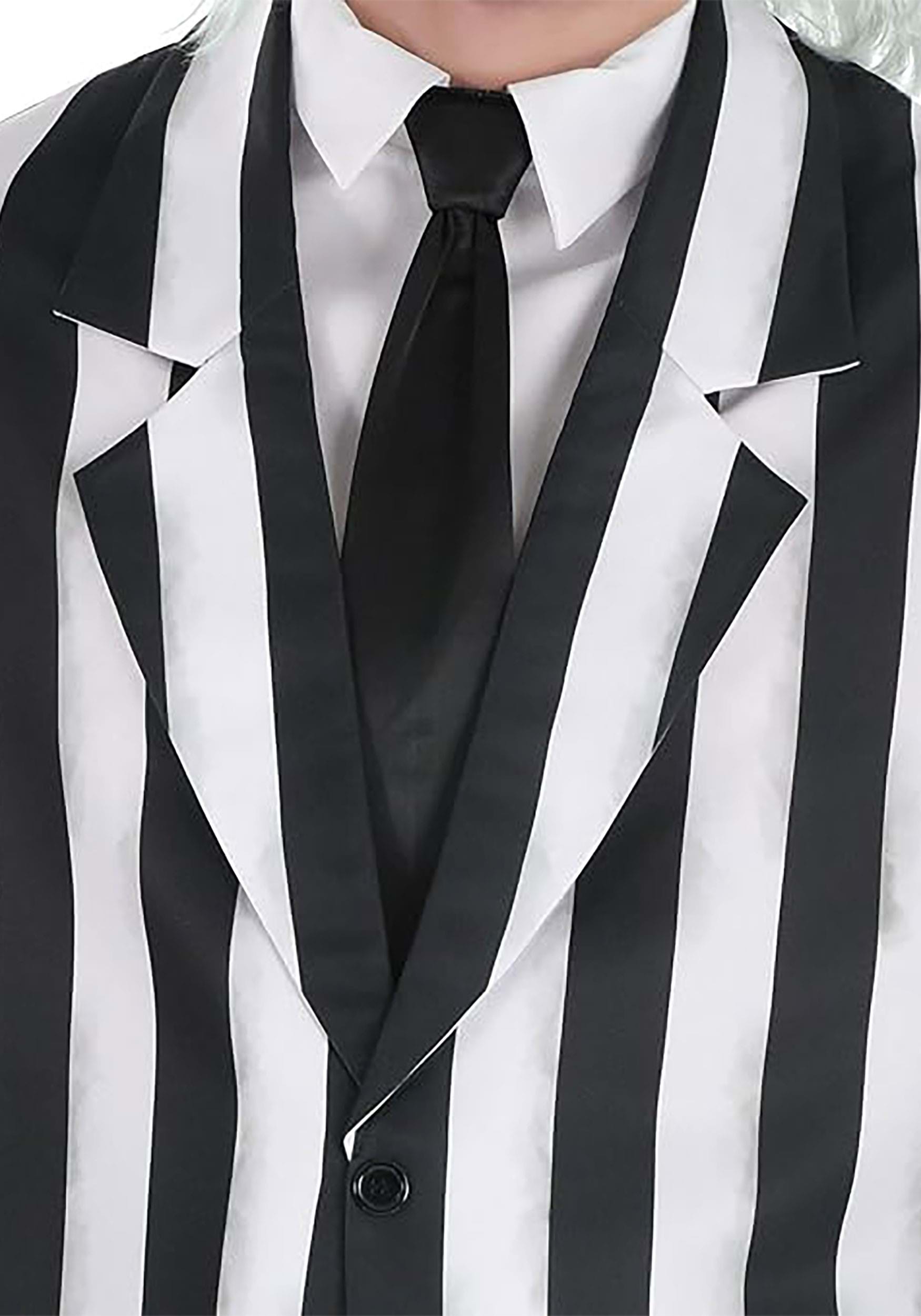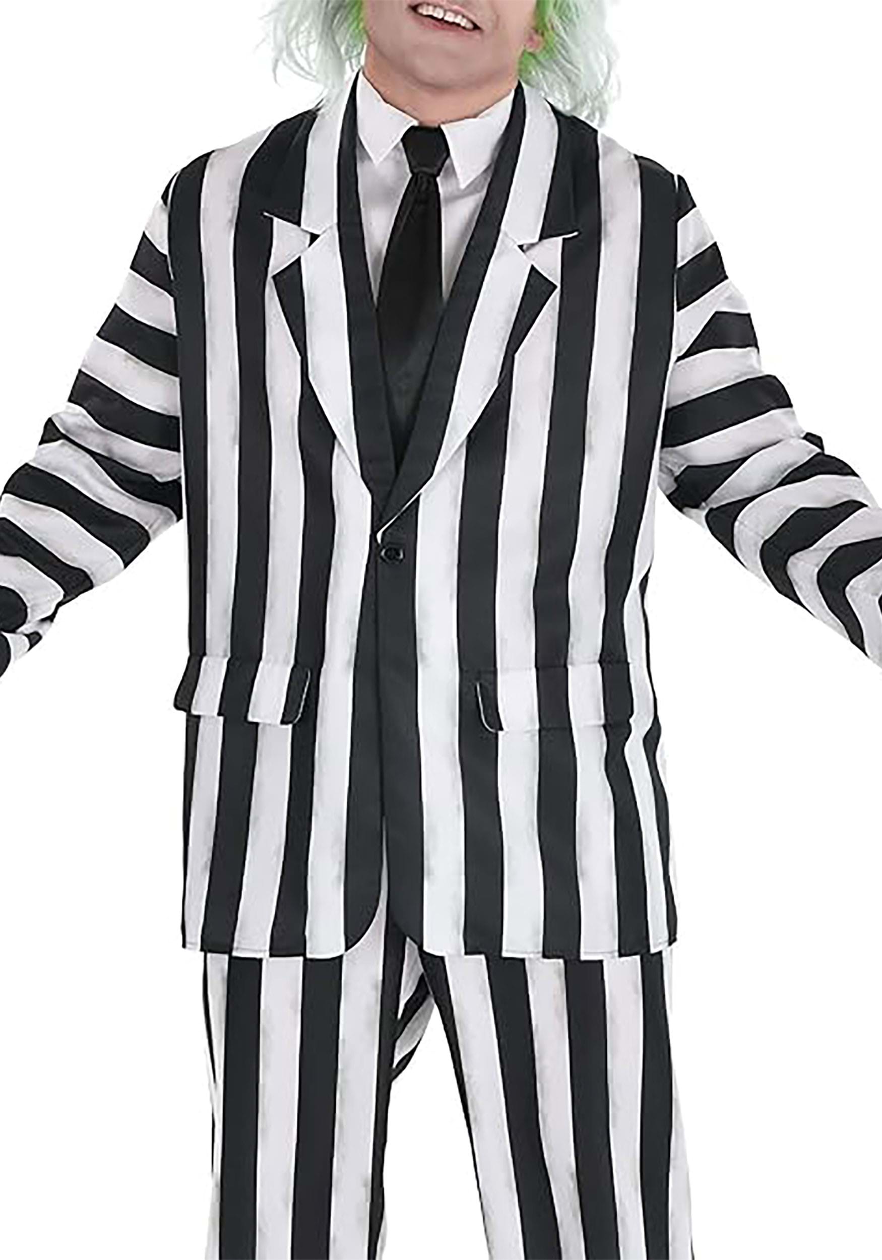 This officially outrageous outfit includes a matching black-and-white striped jacket and pants, with an attached shirt and tie to keep you looking creepily classy. It's got that unmistakable Beetlejuice flair—loud, bold, and weirdly flattering. Made from 100% polyester, it's soft enough for extended haunting sessions and breathable enough to handle dancing, summoning, or whatever happens when you shout your own name three times in a row.