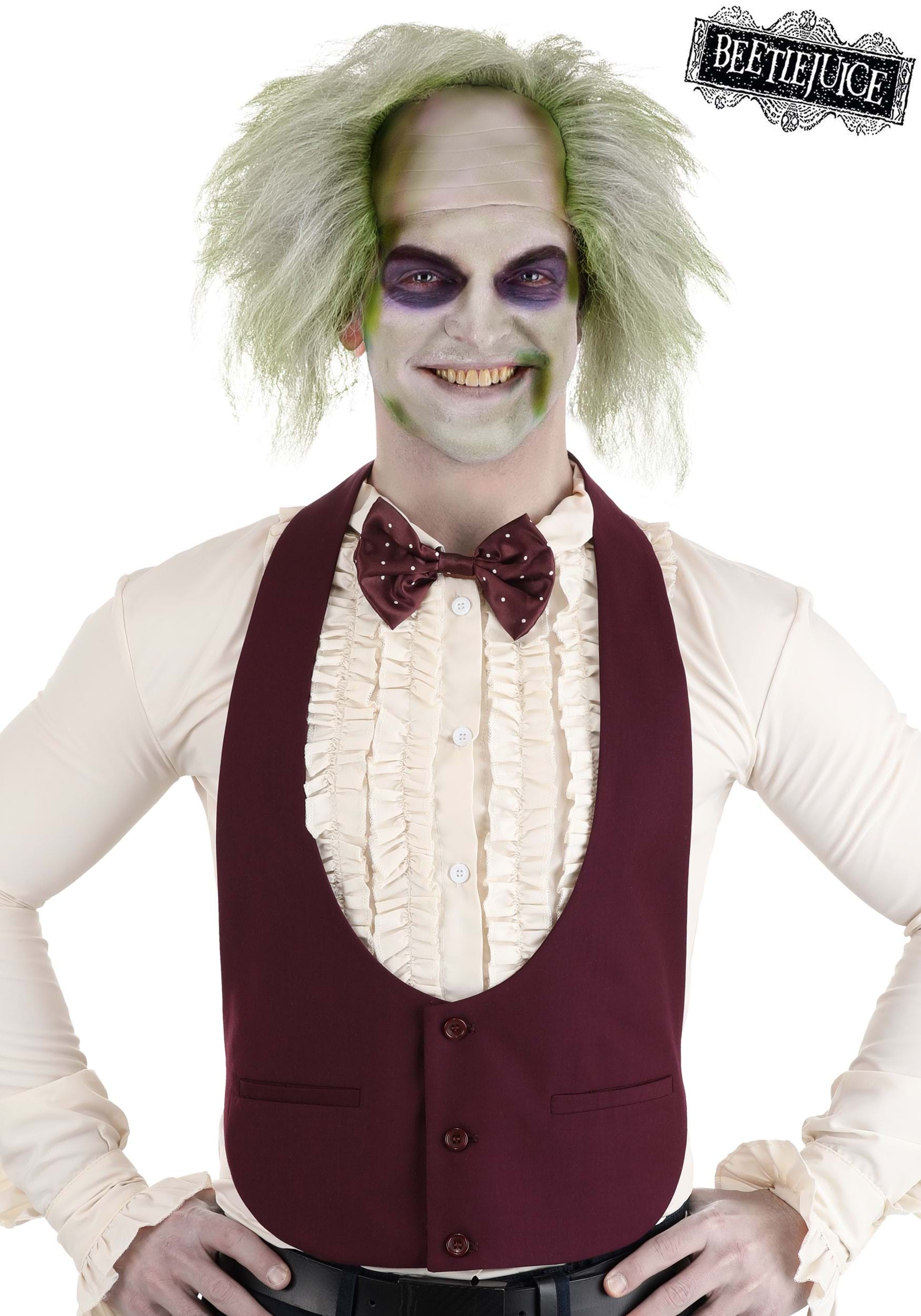 This exclusive, officially licensed Beetlejuice Wedding Suit Vest will make your millenium! The maroon vest has a low V neckline, two faux front pockets, and a three-button closure. It looks just like the one that the troublemaking spirit wore during his attempted wedding to Lydia.