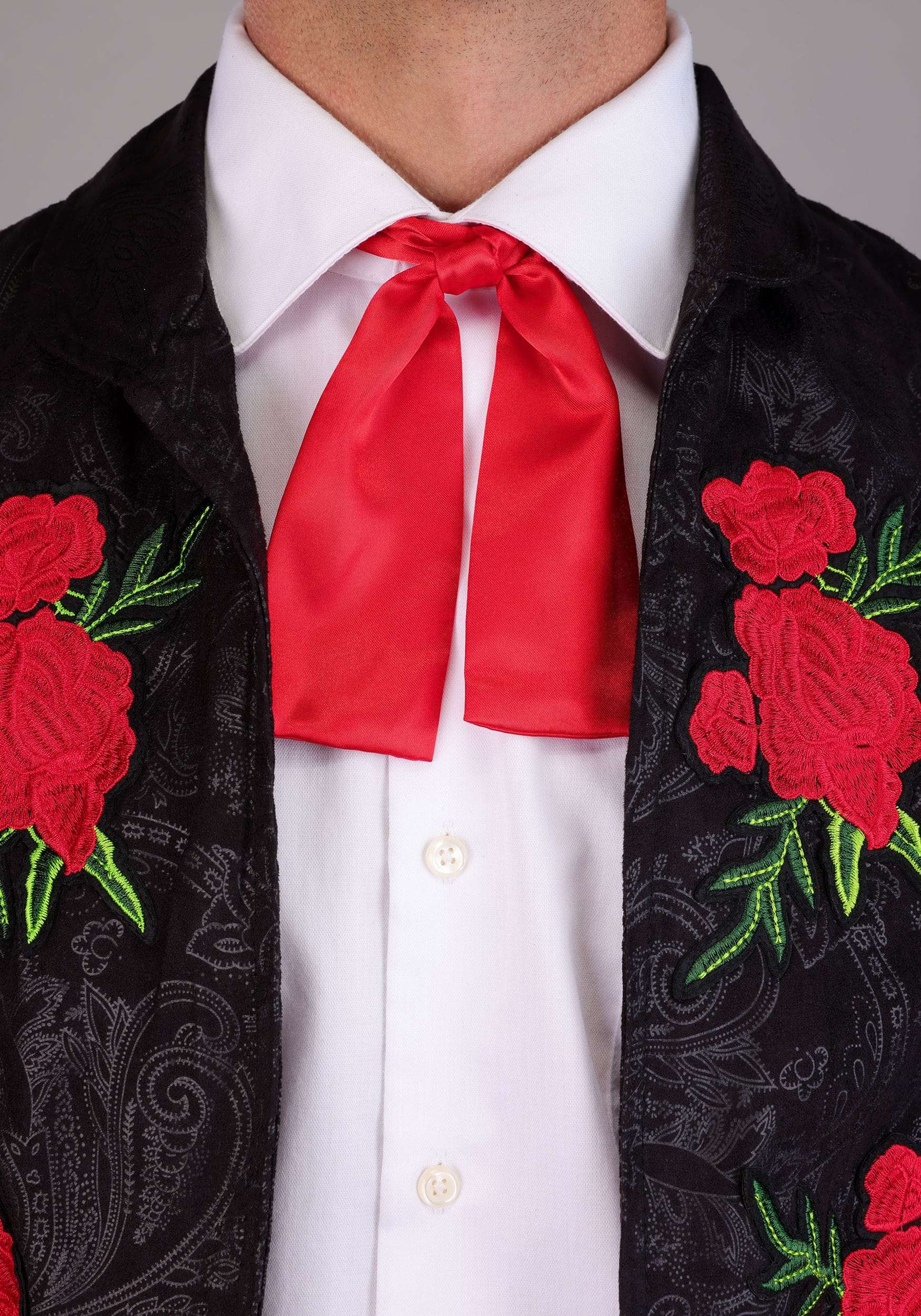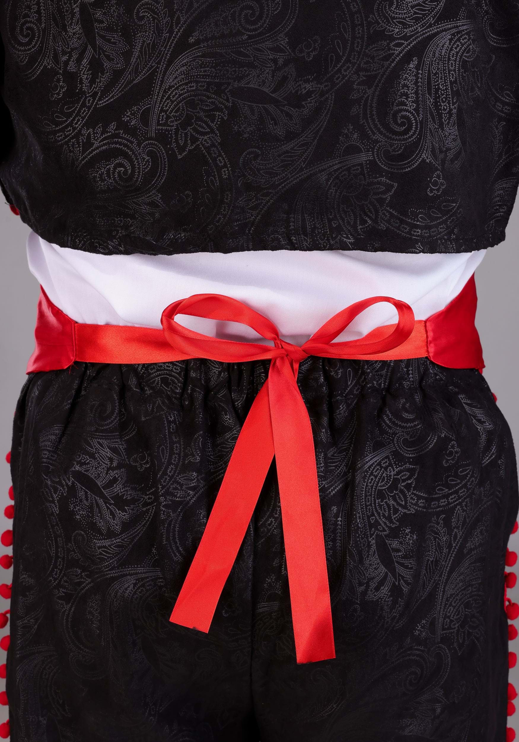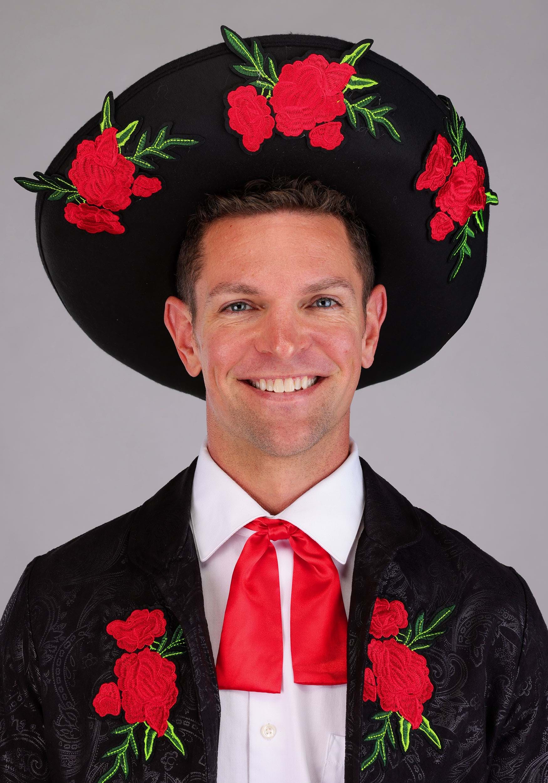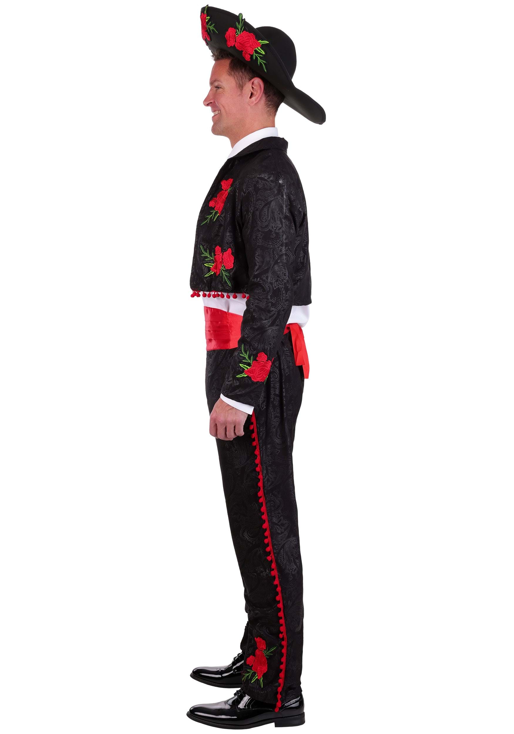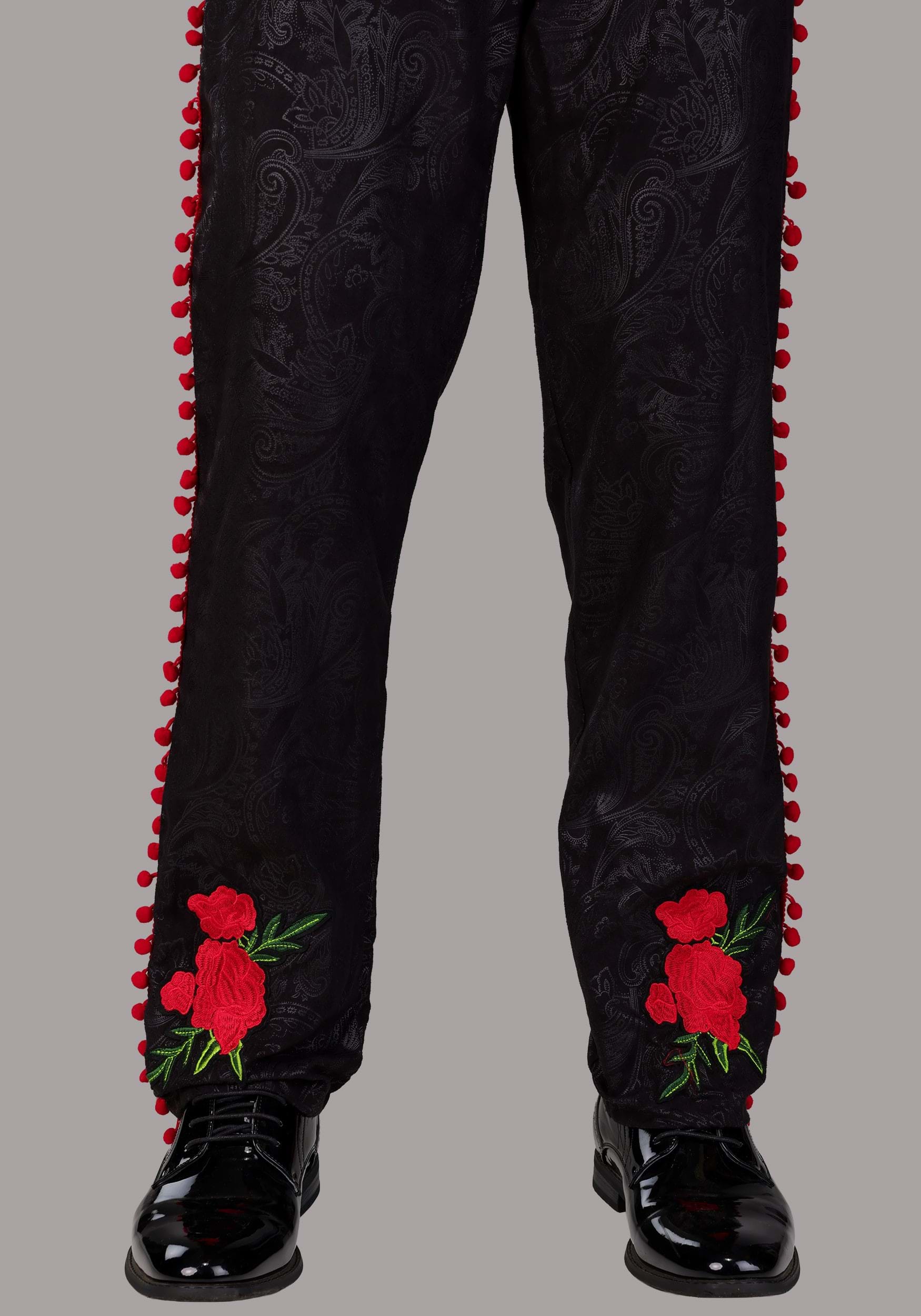 This amazingly detailed and highly exclusive costume is directly inspired by the traditional traje de charro of real mariachi bands in Mexico. It features slim-fitting black pants and a matching cropped jacket, both boasting an intricate tone-on-tone printed pattern that lends a subtle sheen. The focal point of the whole ensemble (aside from your fancy strumming skills, of course) is the pop of vibrant red roses embroidered atop the pant ankles, jacket, and sombrero brim. With the red tie and red waist sash, you're completely ready to book your group its first gig!