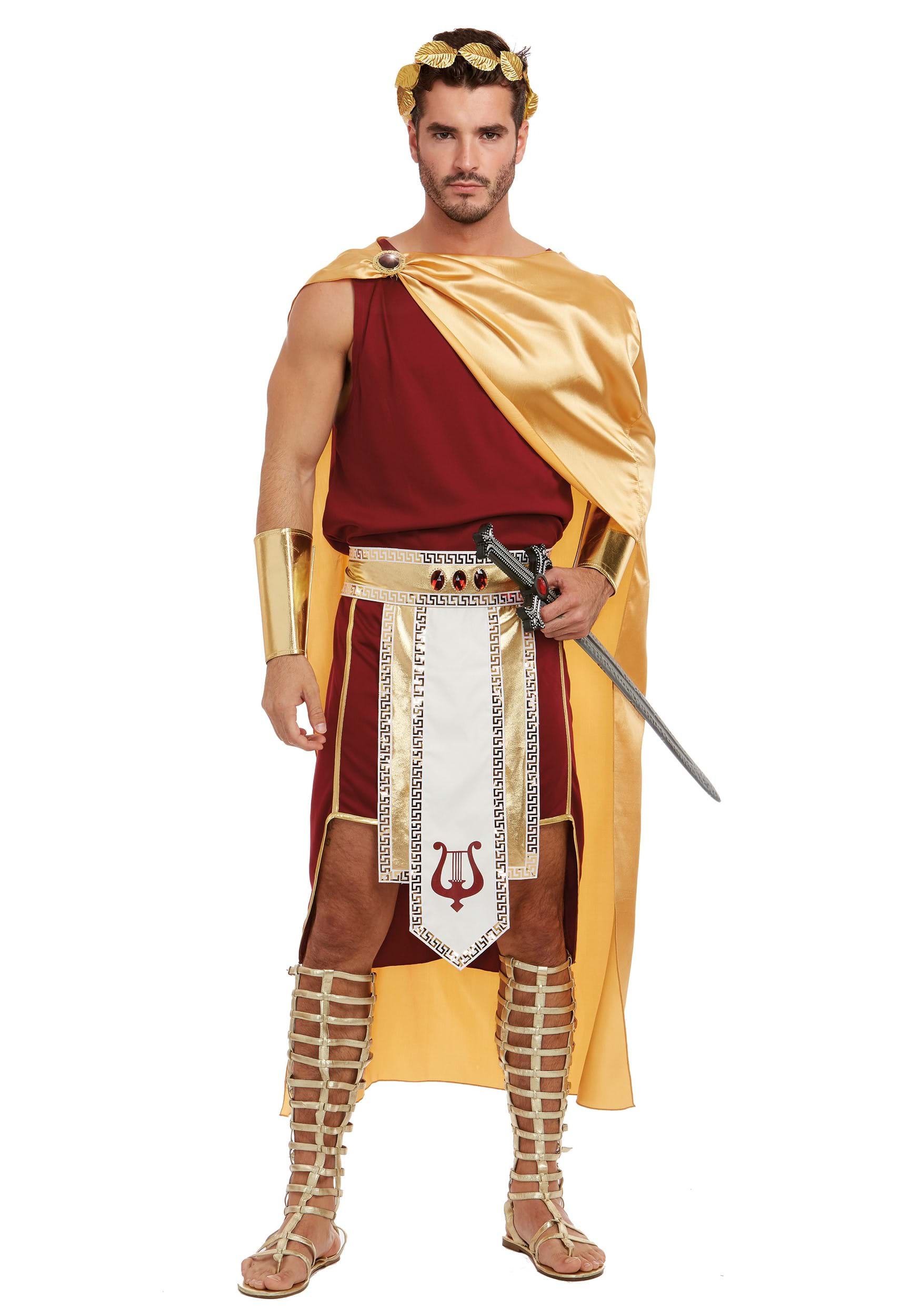 Feel like a god among men at your next costume party in this Men's Sexy Apollo Costume. This ancient Greece-inspired outfit comes with a shirt, cape, skirt, wrist gauntlets and a headpiece. The regal red shirt can be left off if you're especially daring, and the red and gold Greek-styled skirt is embellished with a lyre print, gleaming golden trim and three red faux jewels near the waist. There's also a gold polyester satin cape with a large ruby stone at the shoulder. To complete the look, the costume comes with soft golden wrist gauntlets and a gold leaf headpiece. (The sword and gladiator sandals are not included.)