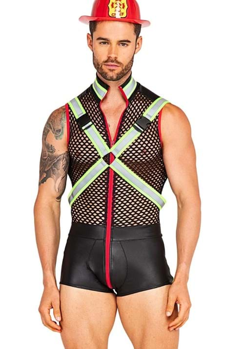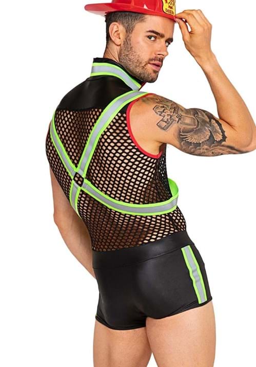 - Shirt portion of bodysuit is mesh, shorts portion is stretch knit w/ shiny faux leather finish