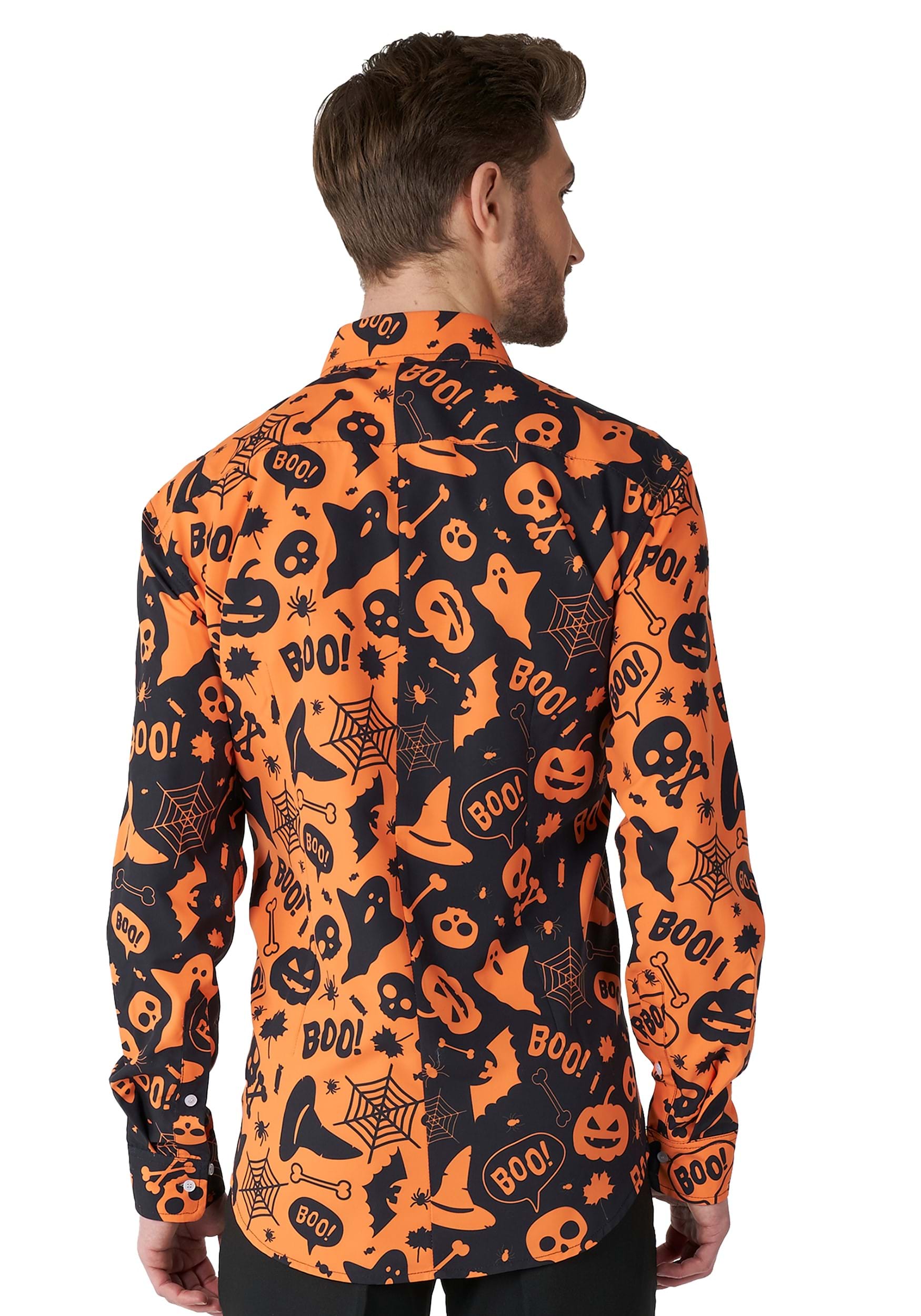 Dress to impress in this Suitmeister Button Up Halloween Icon Shirt For Men! The button-up shirt has one orange and one black sleeve, and the front and back of the torso also alternate colors on each side. The entire shirt is printed with a riotously fun pattern of jack o' lanterns, ghosts, skulls, spiderwebs, witch hats, and other iconic Halloween symbols.