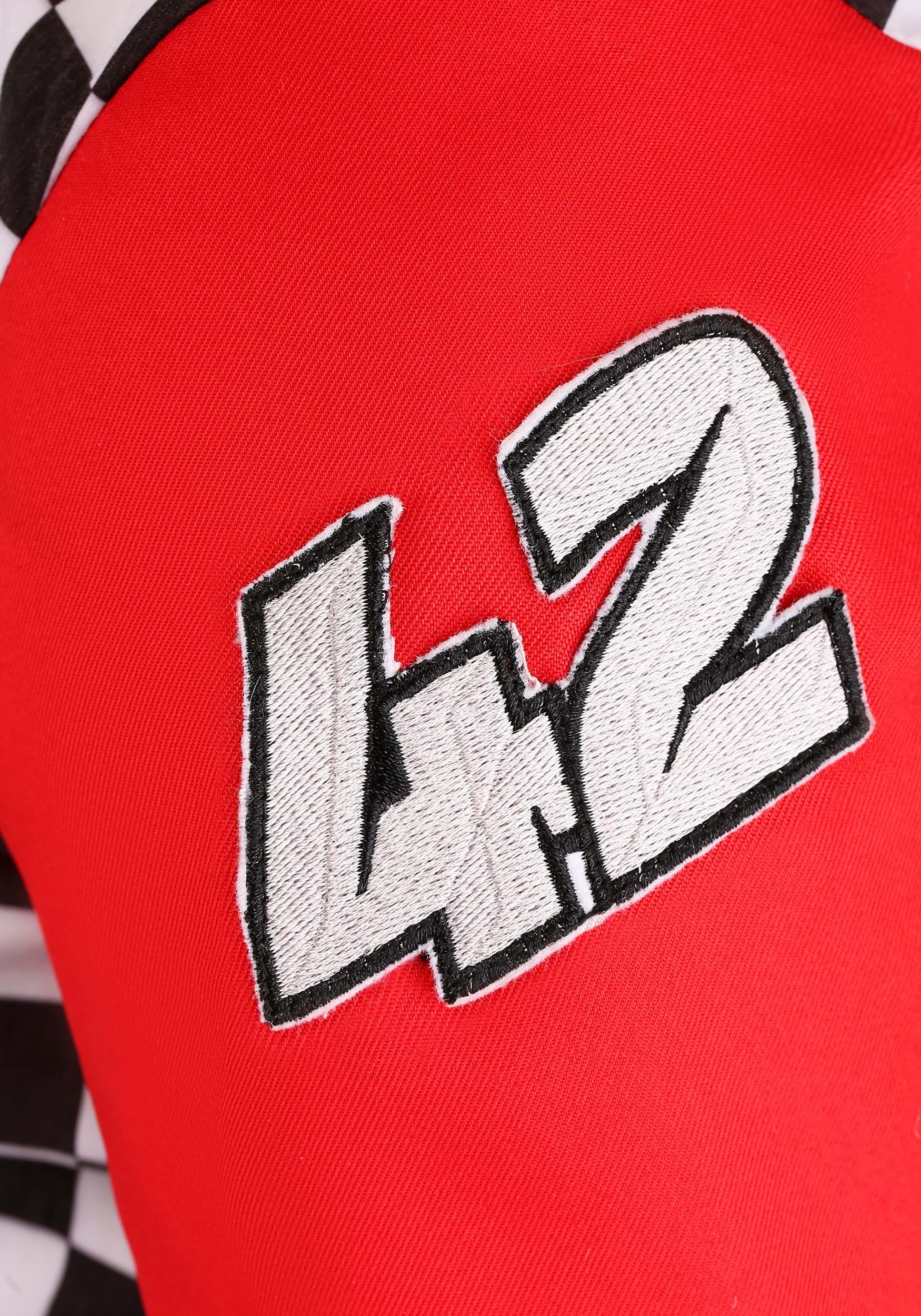 - Main body red, sleeve, and cuff: 100% polyester, Main body black and white textile: 97% polyester, 3% cotton