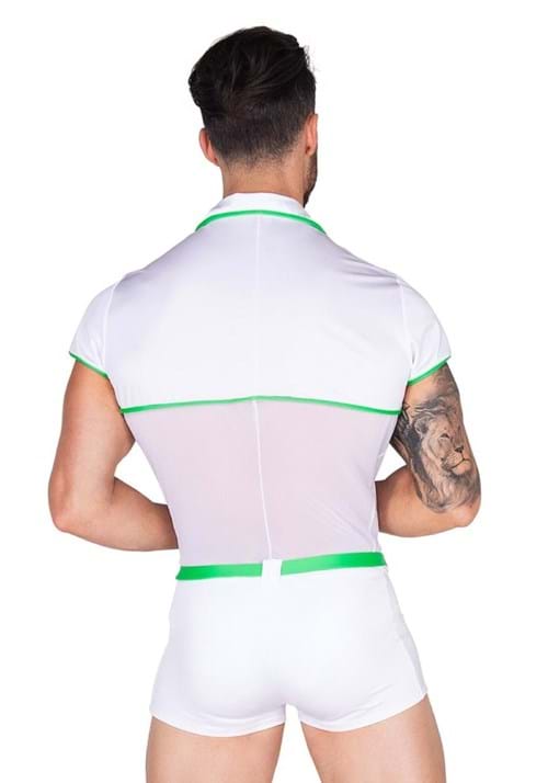 - Body of jumpsuit is mesh; yoke, sleeves, & shorts portion are stretch knit
