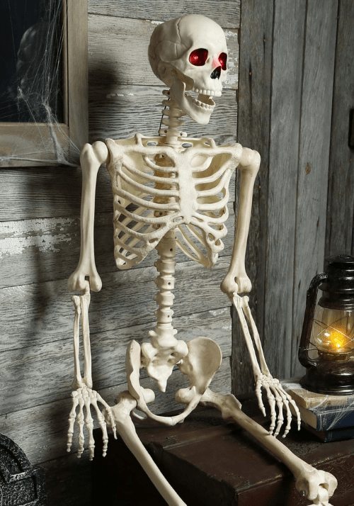 This bleached skeleton figure is five feet tall and detailed to send an eerie chill through the spines of trick-or-treaters and visitors alike! He can be hung from a loop at the top of his head from a range of places. Mr. Crazy Bone has light-up eyes that blink and a jaw that moves up and down as he says a variety of spooky phrases. Sound activated, this skeleton is an awesome way to greet trick-or-treaters!