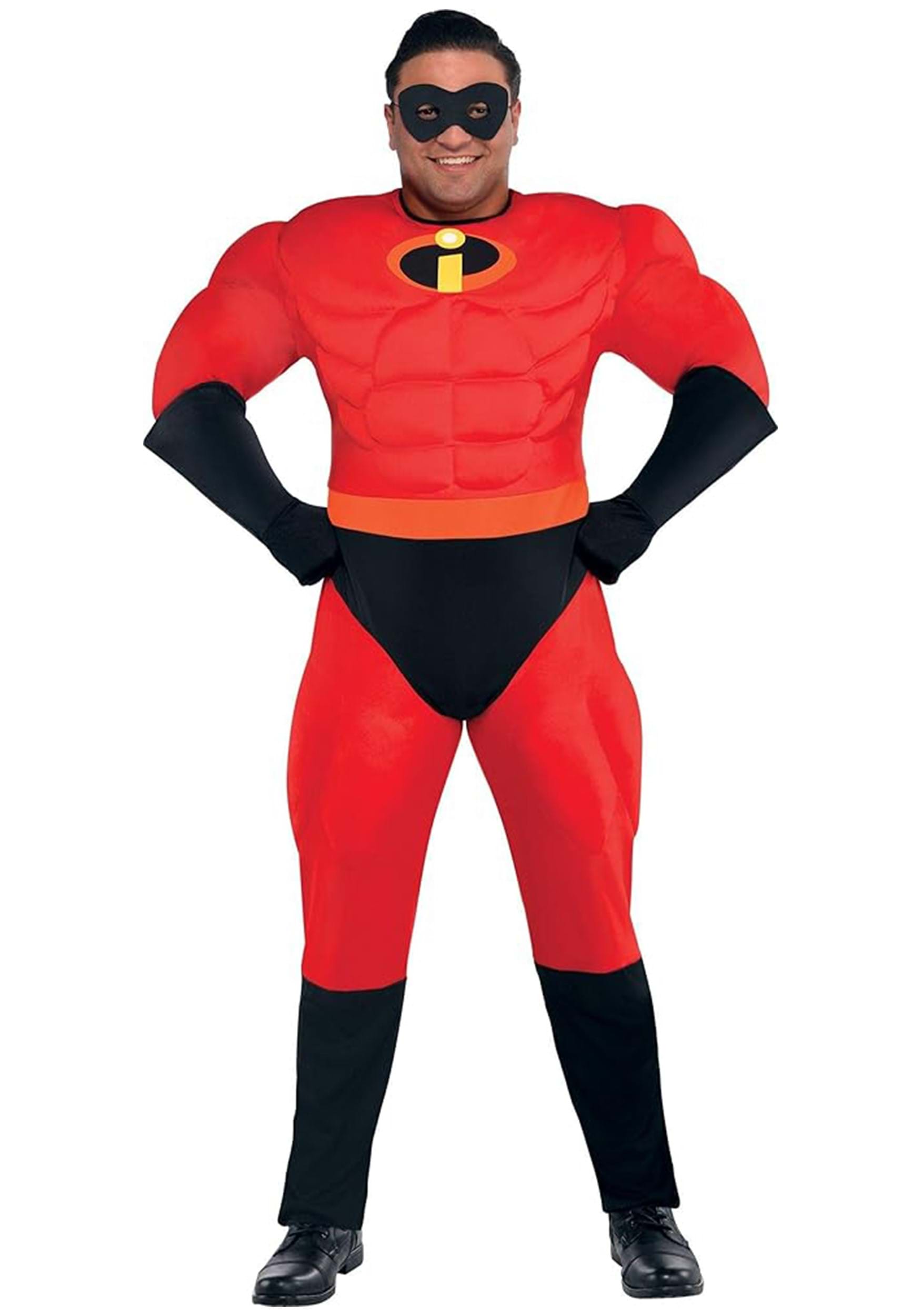 - Stretchy jumpsuit has muscular padding, zipper down center back