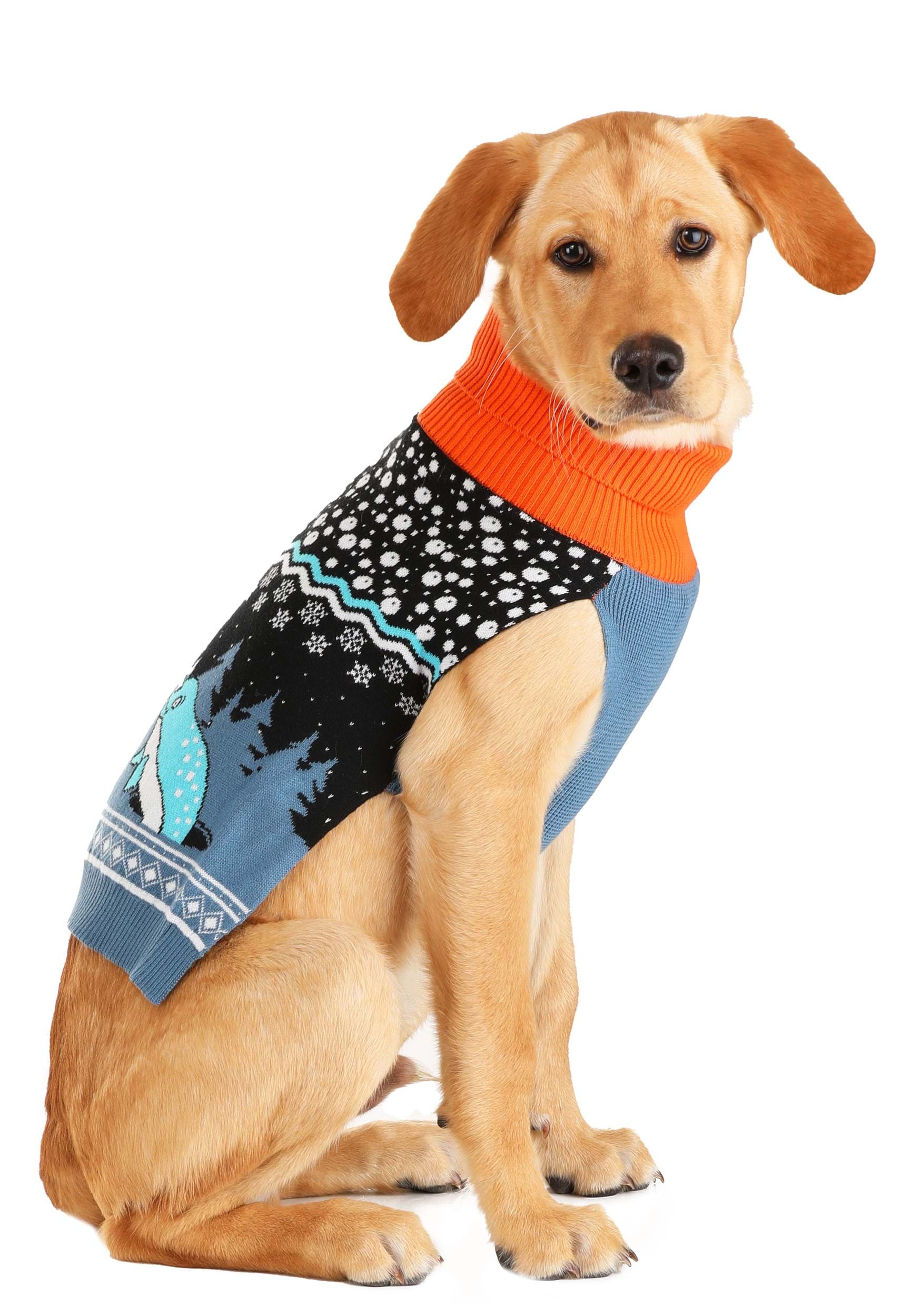 The pet-friendly knit sweater has a simple design that slips over the head and front legs for a secure fit. A rib-knit turtleneck collar offers additional warmth. The length of the sweater features a full-coverage illustration of two narwhals roasting marshmallows in a snowy setting. And while that trip to the arctic to visit narwhals may still be out of the question, a small opening at the back provides an easy way to connect leash and collar for a casual winter walk.