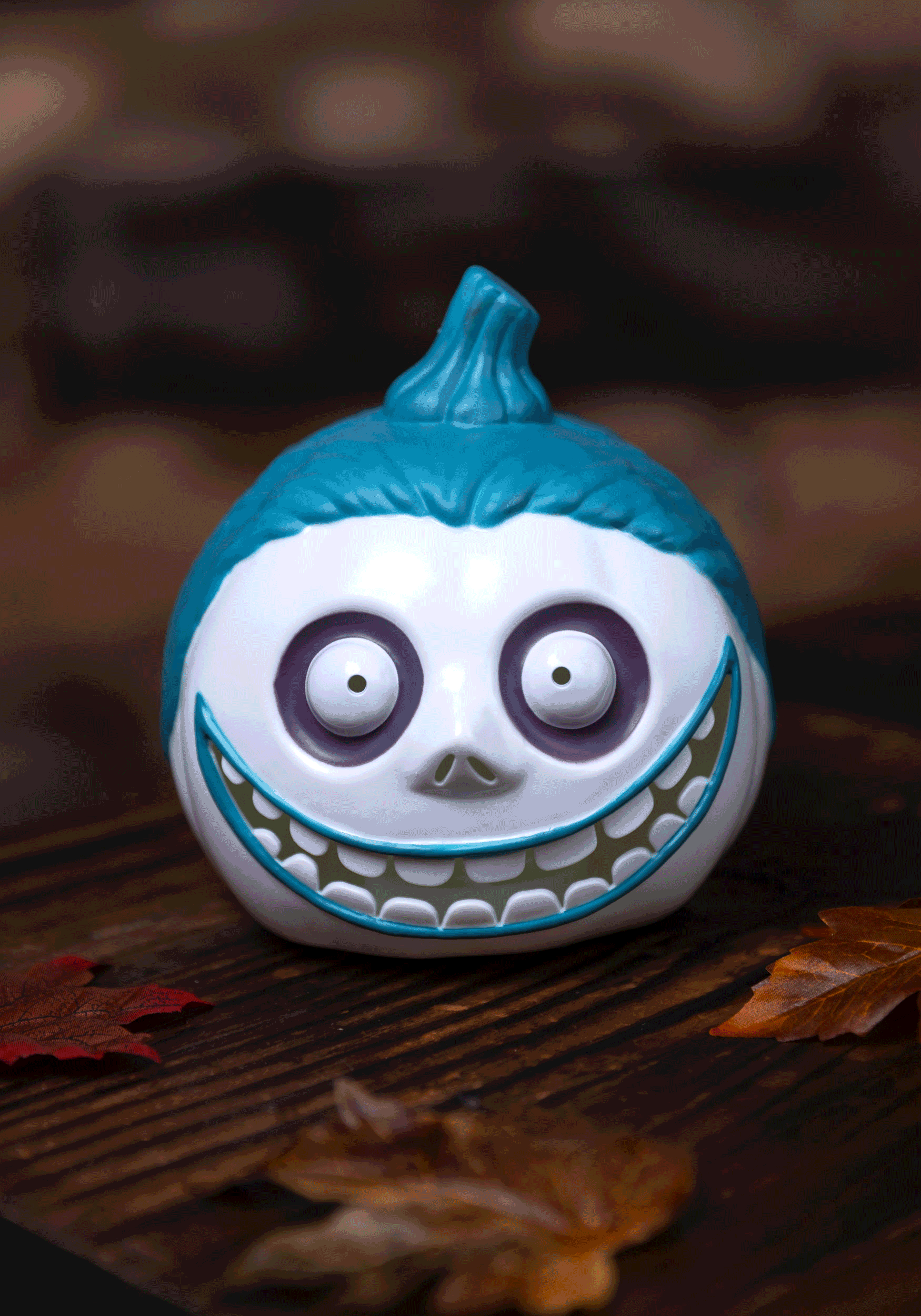 This officially licensed Nightmare Before Christmas 6-Inch Barrel Light Up Pumpkin Decoration is clearly up to no good! The molded plastic pumpkin is decorated to look like Barrel's grinning face, complete with teal "hair." When activated, the inner LED bulb illuminates the pumpkin's cut-out eyes, nostrils and mouth.