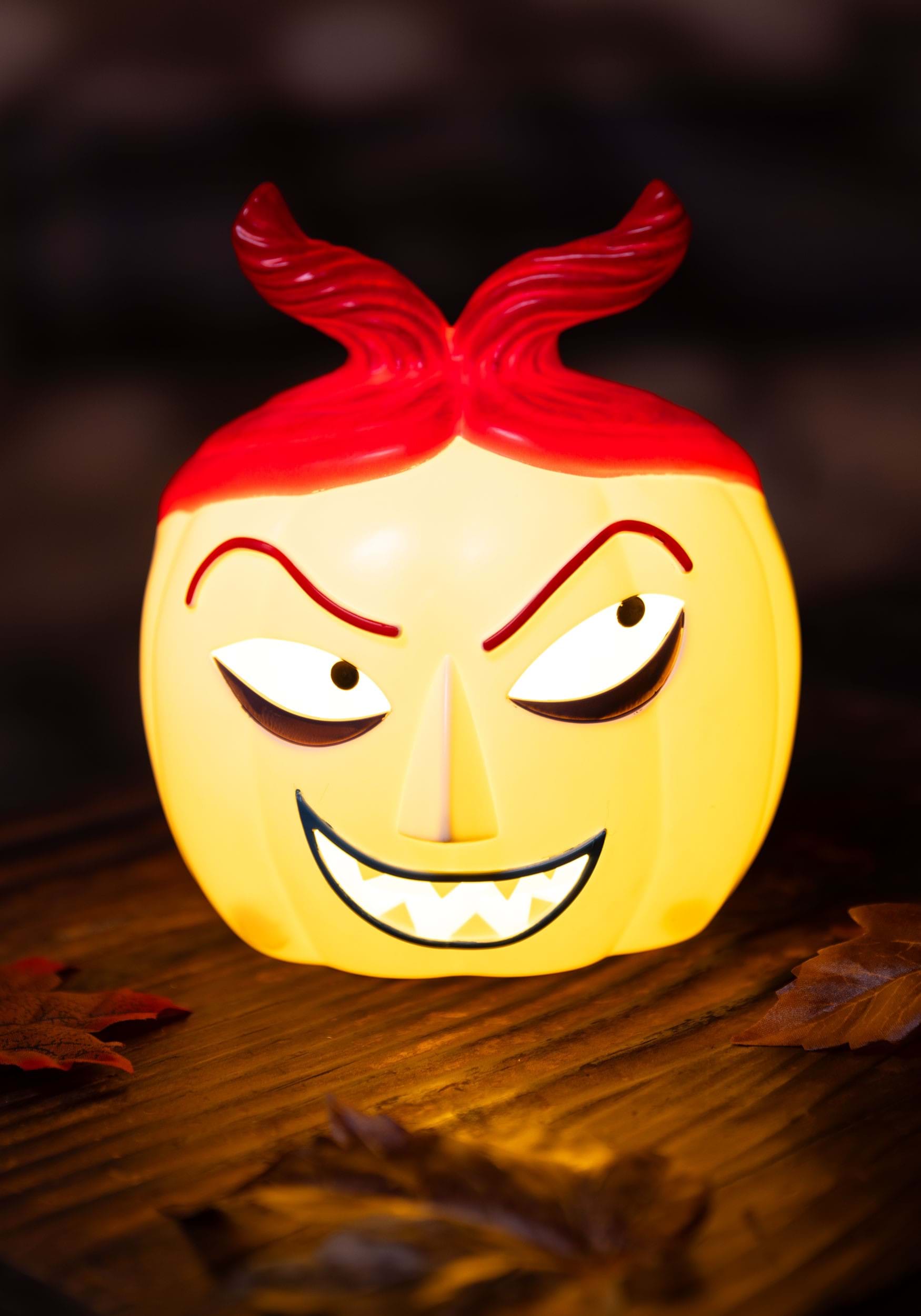 This officially licensed Nightmare Before Christmas 6-Inch Lock Light Up Pumpkin Decoration promises not to get into trouble while it's on display in your home... maybe! The molded plastic pumpkin is decorated with Lock's facial features and red "hair." When activated, an inner LED light glows through the decoration's cut-out eyes and mouth.